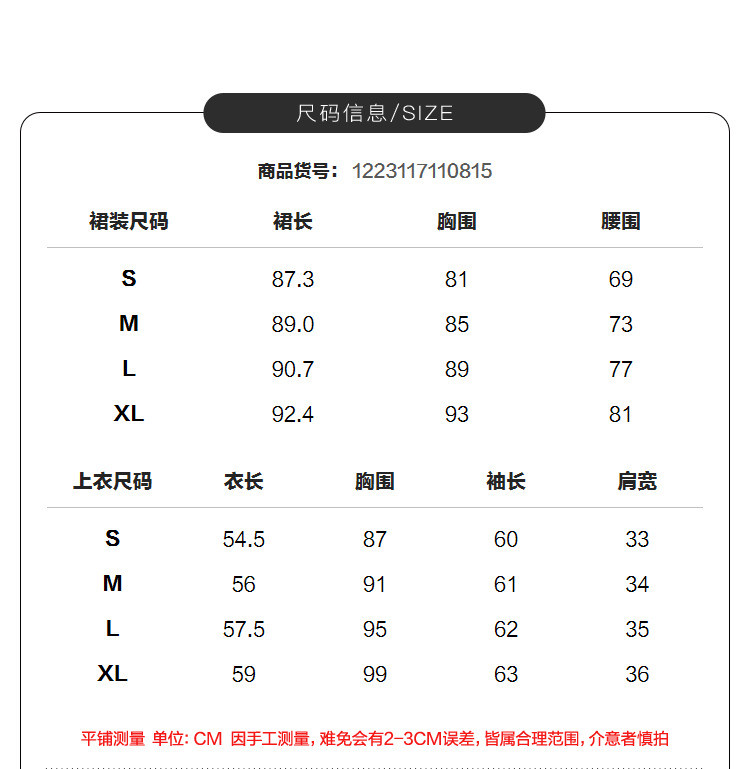 | 尺码 | 裙长(cm) | 肩宽(cm) | 袖长(cm) | 上装号型 | 下装号型 | 衣长(cm) | 身高(cm) | 腰围(cm) | 臀围(cm) | 胸围(cm) |
