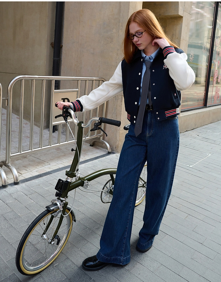 小熊春秋款时髦翻边直筒裤阔腿裤牛仔裤高腰长裤宽松 220801