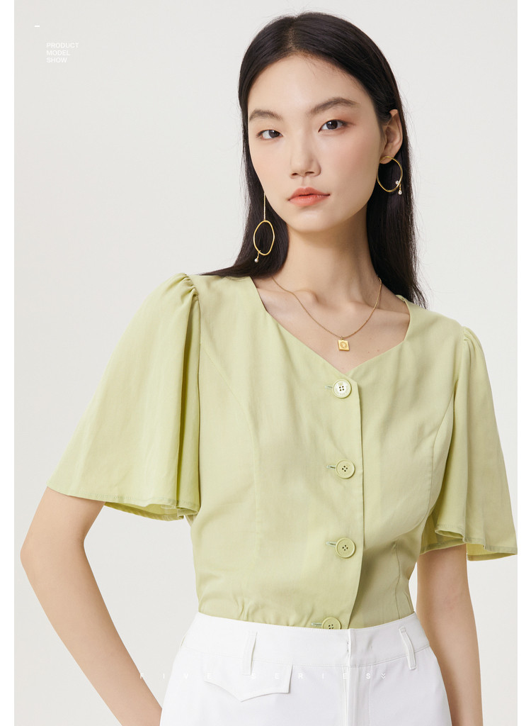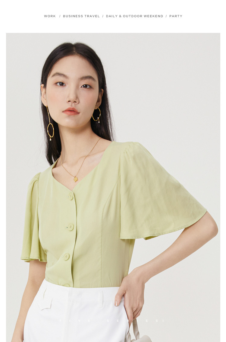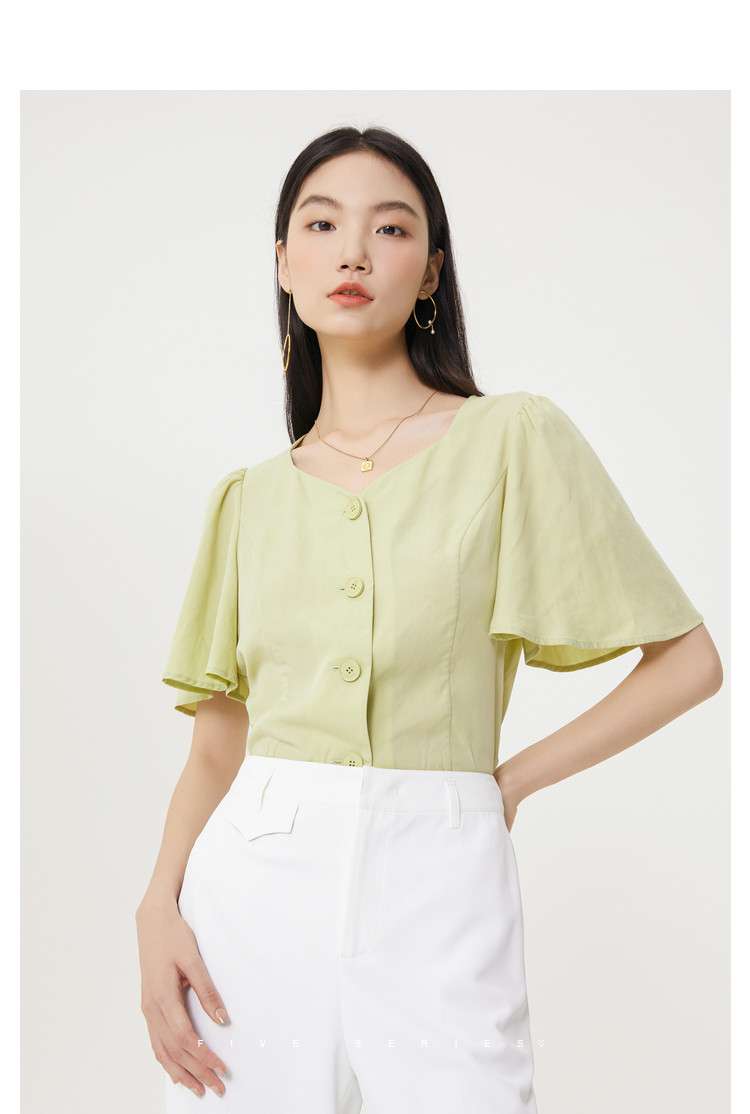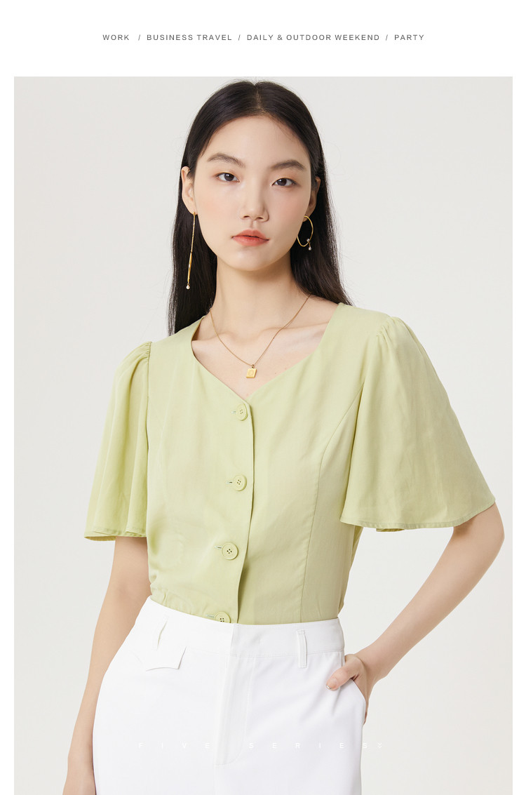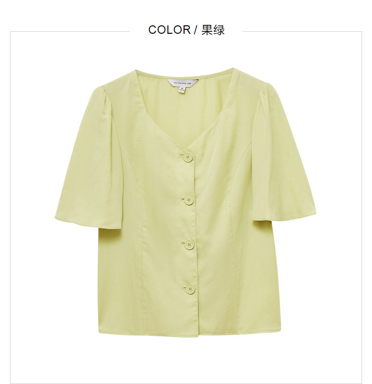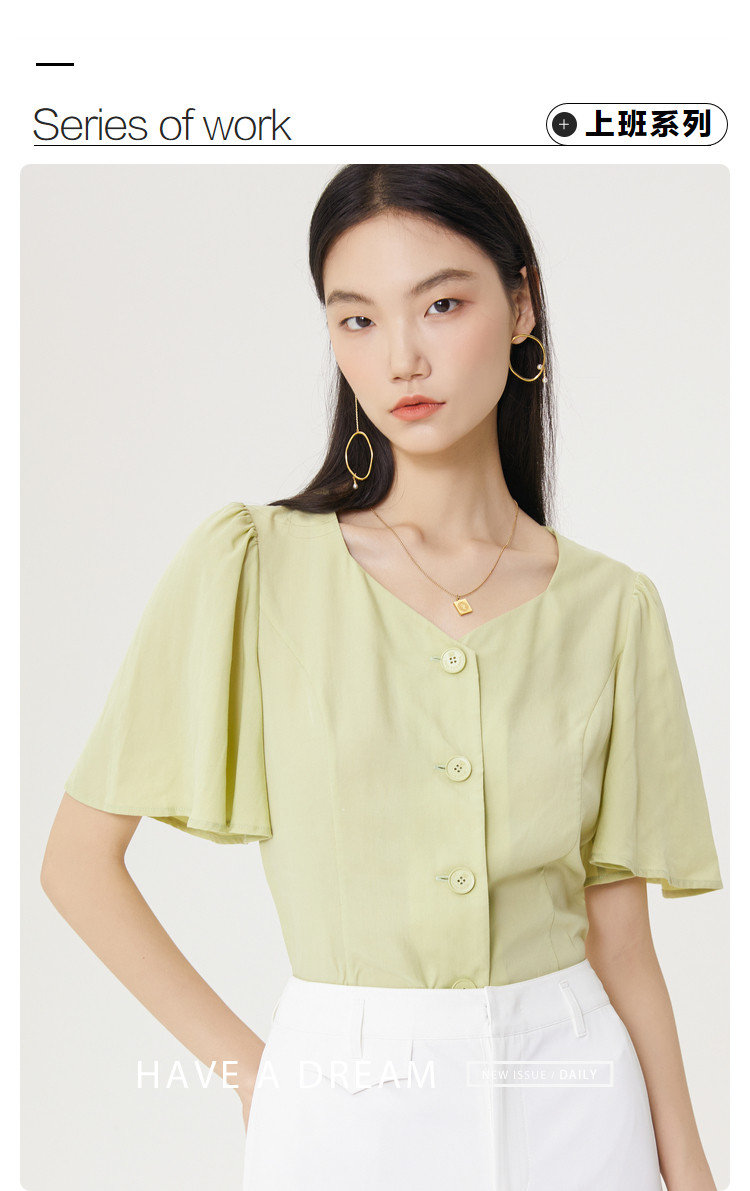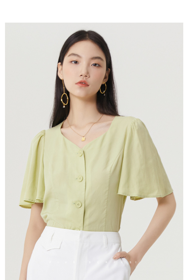 商品名称:果绿色小众衬衫女夏季显瘦通勤荷叶边衬衣气质百搭桃心V领上衣女 840451