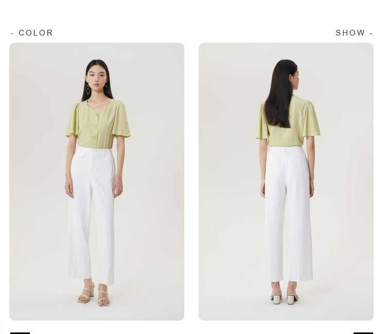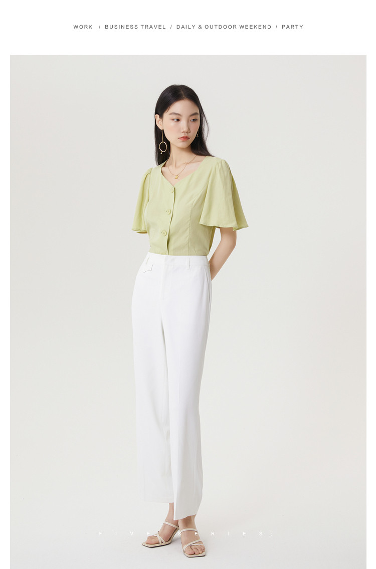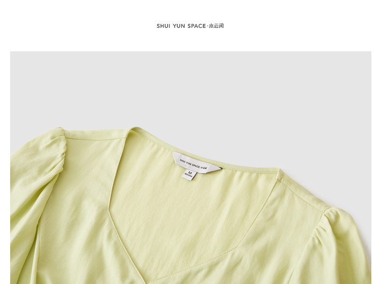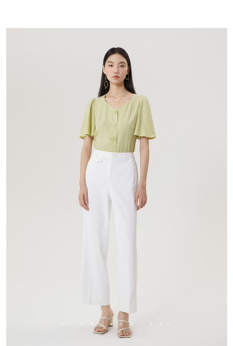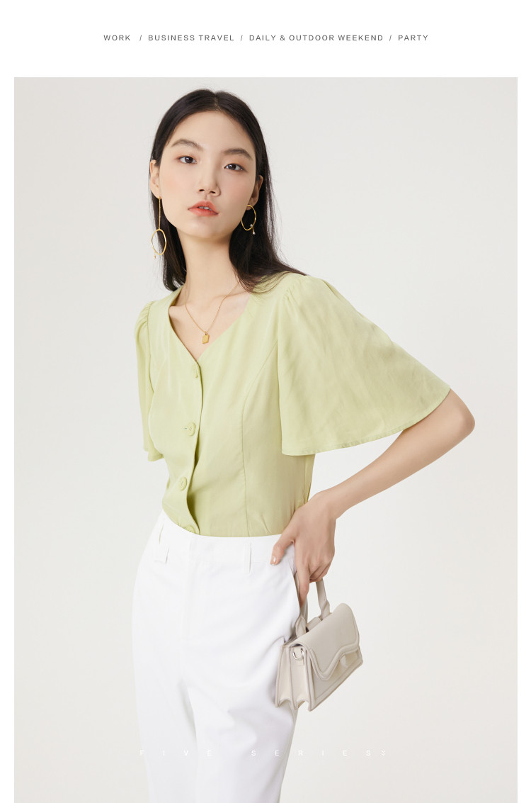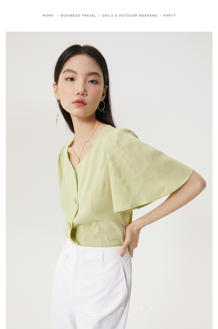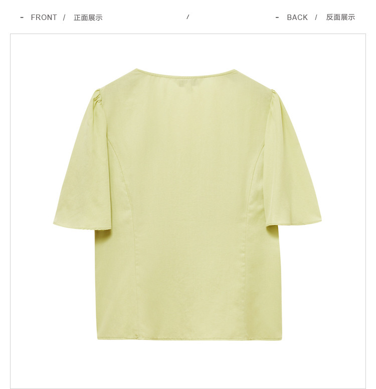 商品名称:果绿色小众衬衫女夏季显瘦通勤荷叶边衬衣气质百搭桃心V领上衣女 840451