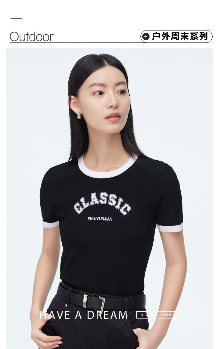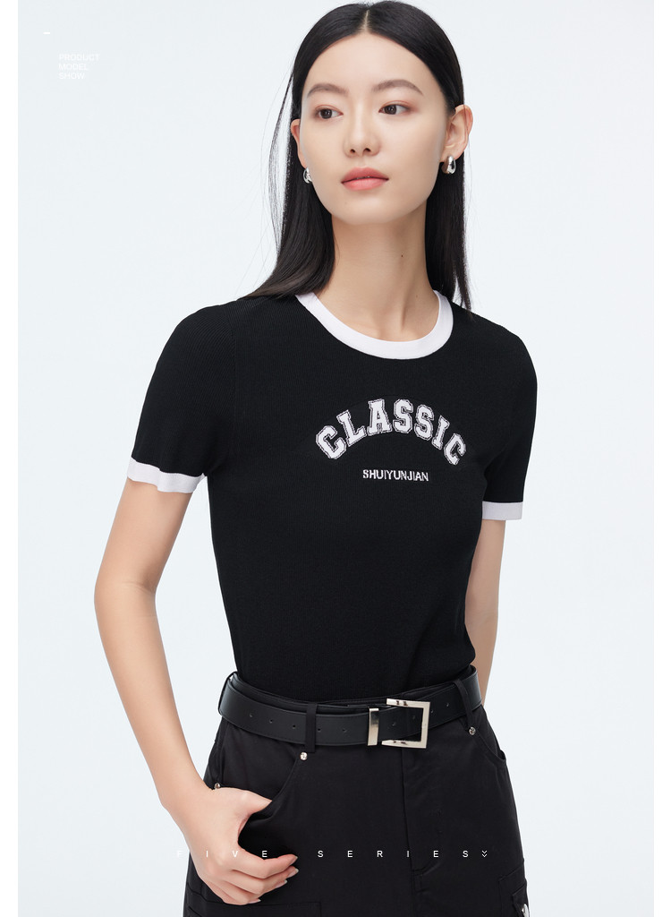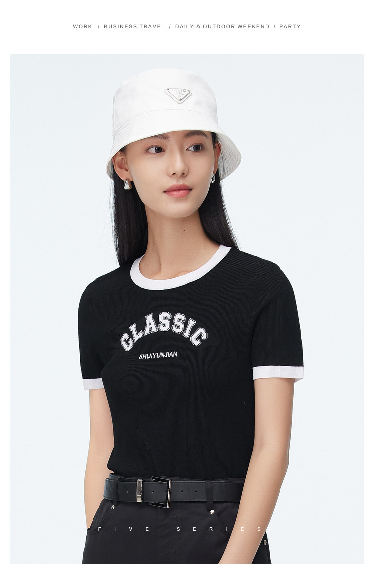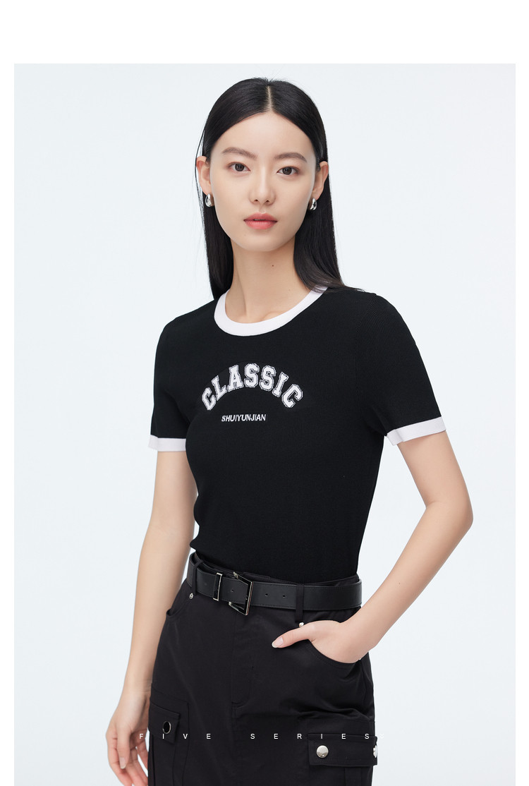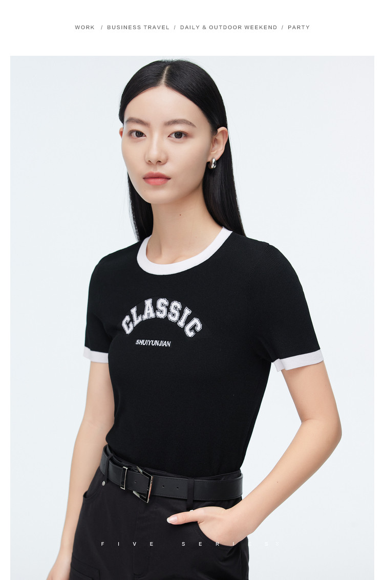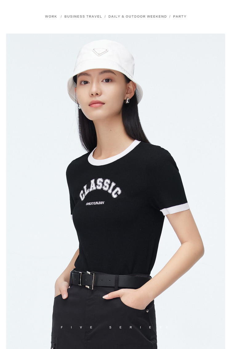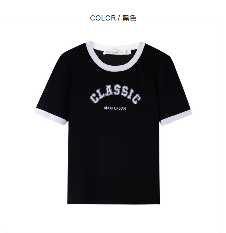 商品名称:黑色圆领短袖T恤女夏款百搭字母印花设计修身休闲上衣女 874371