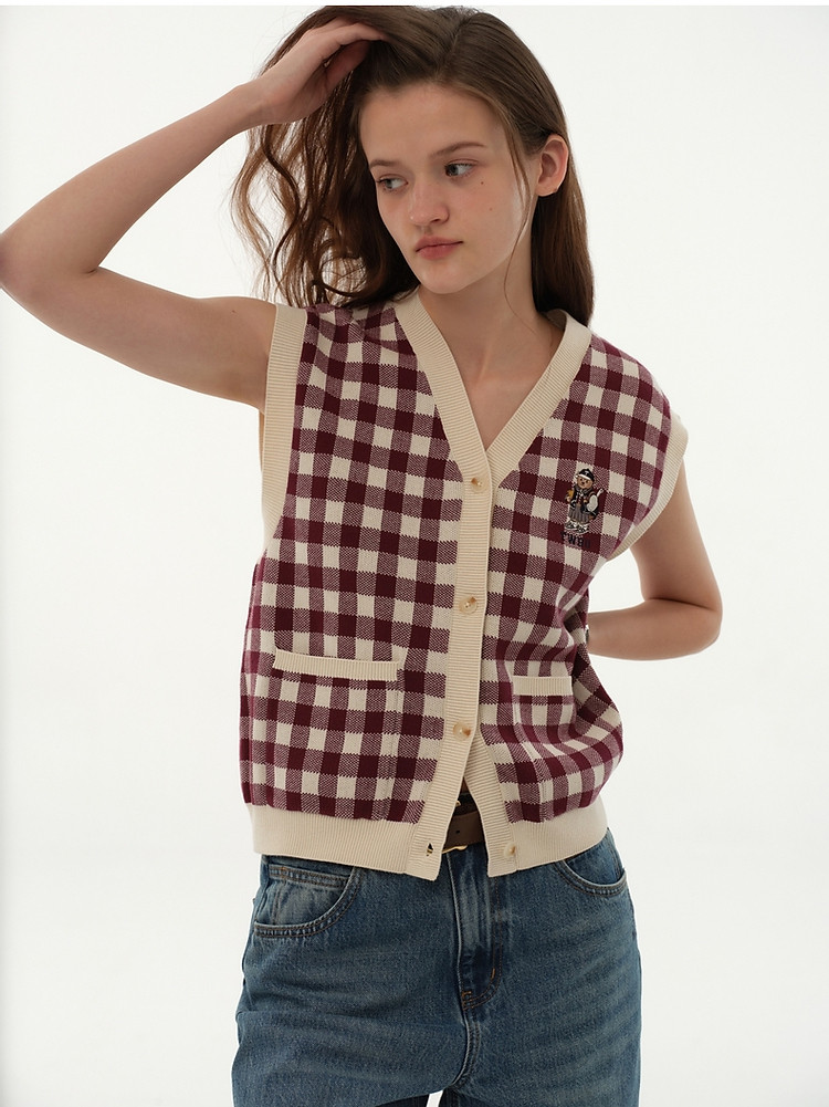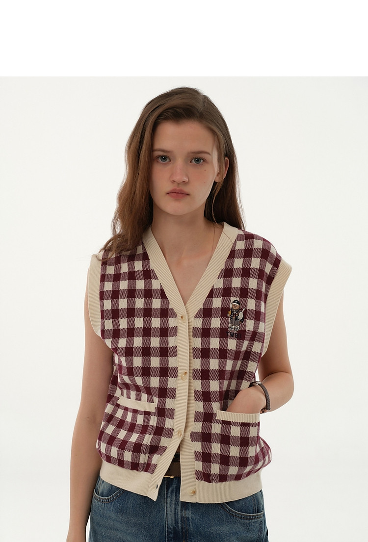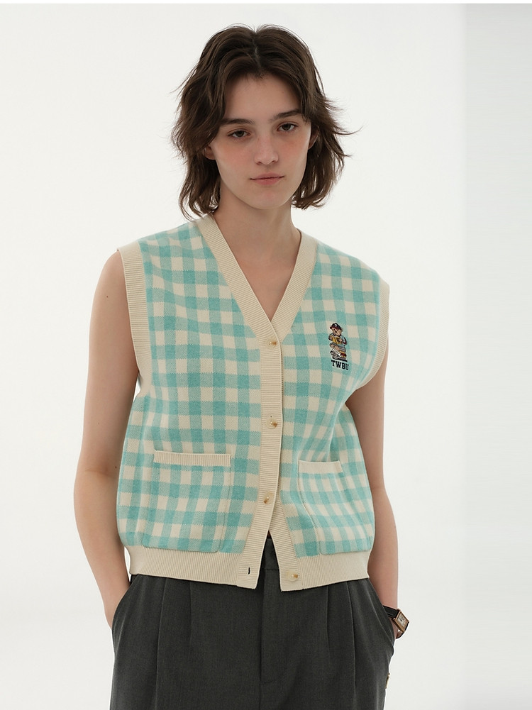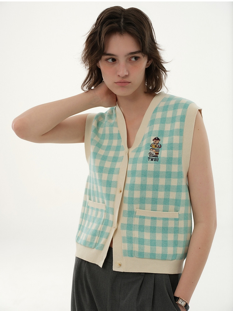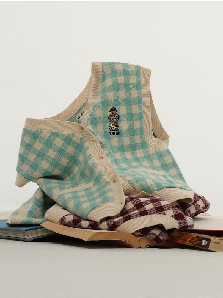 小熊多巴胺格纹毛衣开衫马甲背心针织衫 916929