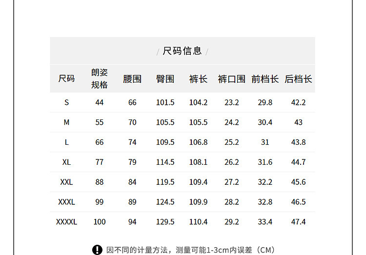 | 尺码 | 后浪(cm) | 裤脚围(cm) | 腰围(cm) | 裤长(cm) | 前浪(cm) | 臀围(cm) | 号型 |