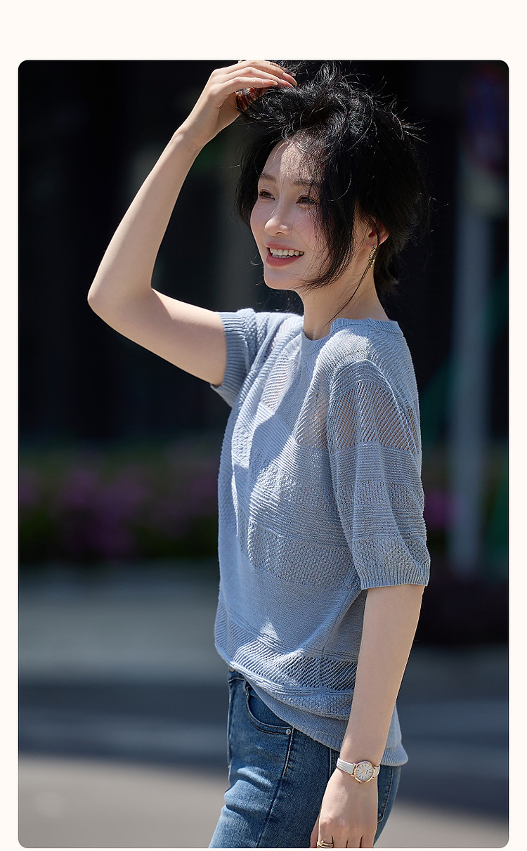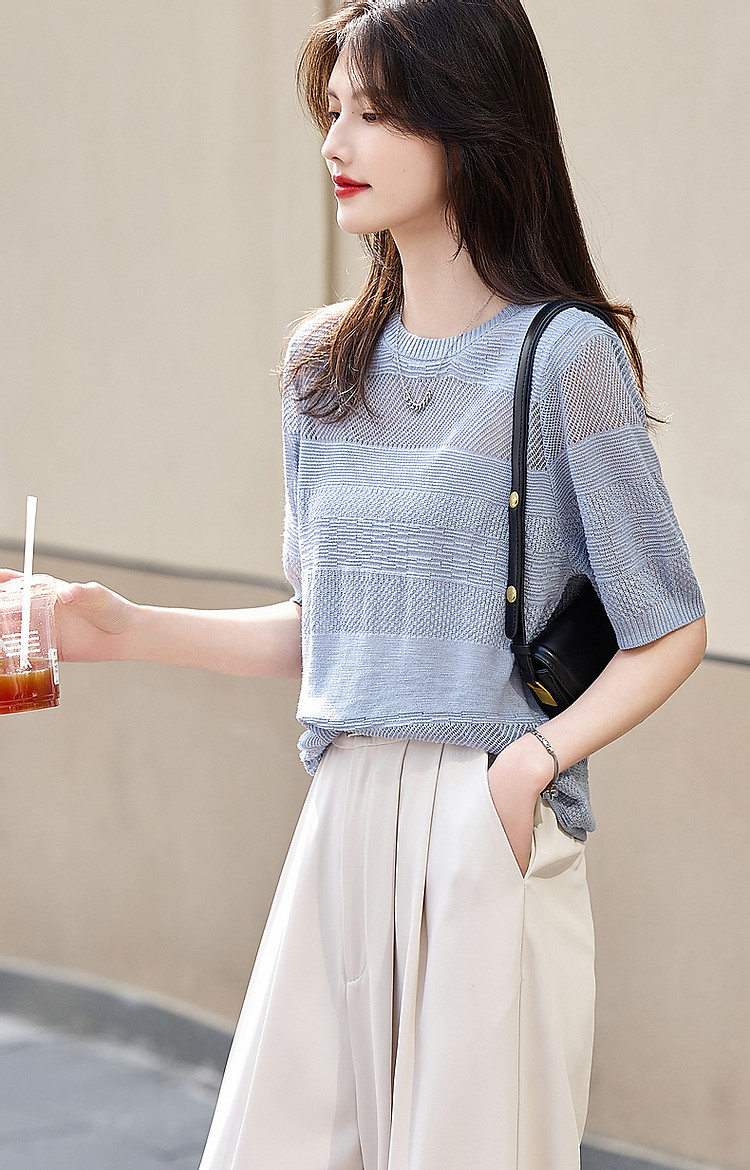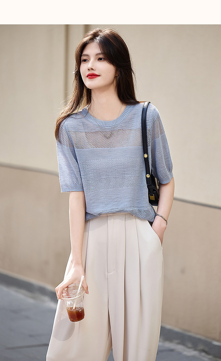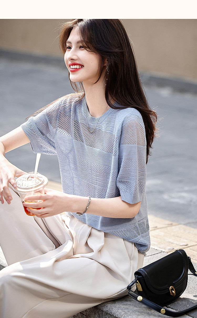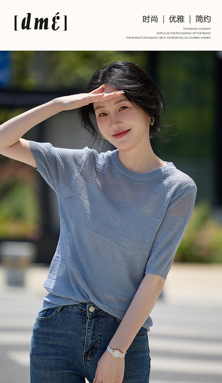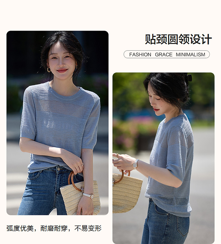 【法风浮雕肌理】夏优雅不重样圆领线衫局部镂空质感针织衫女上衣 449537