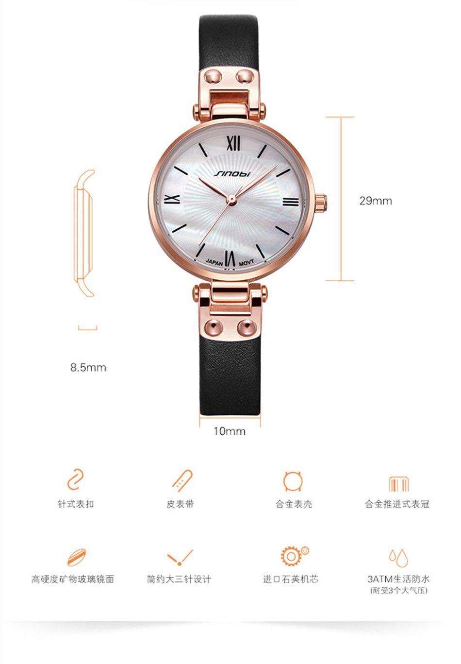 商品名称:sinobi 时尚轻奢女款石英手表11S9818L01玫壳白面玫色表带