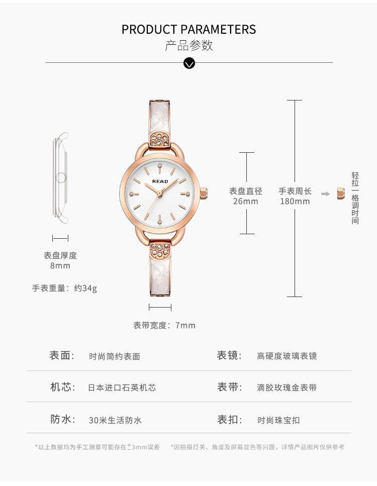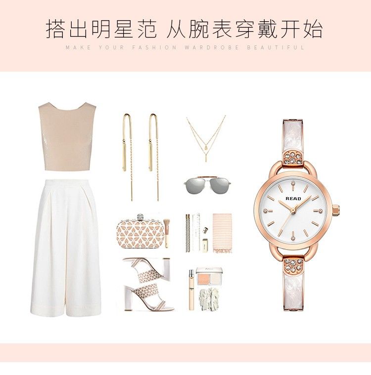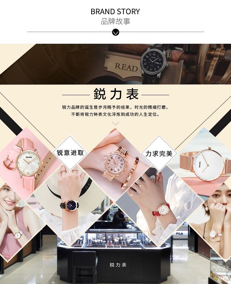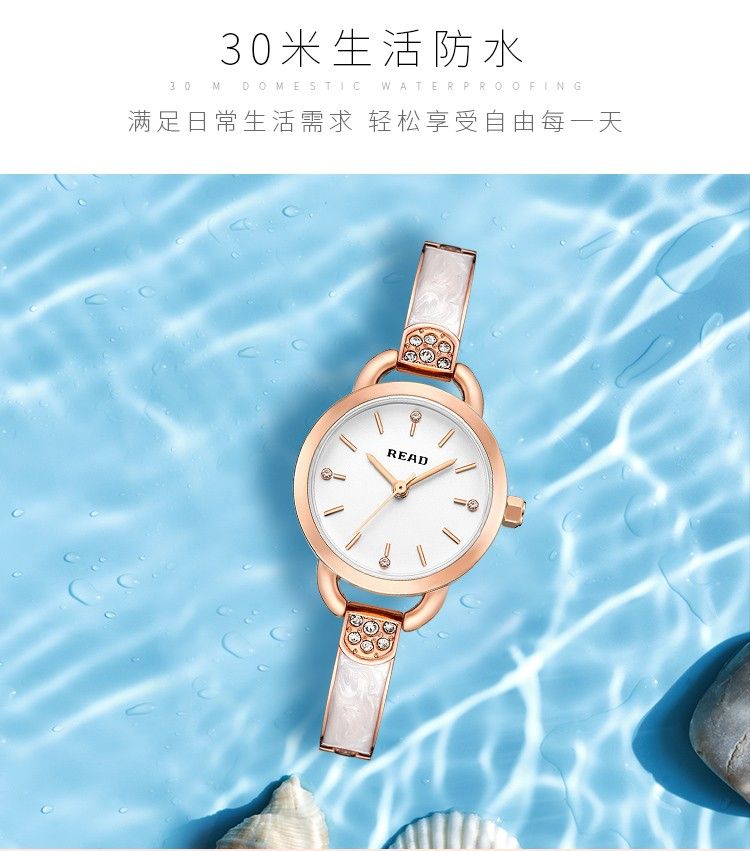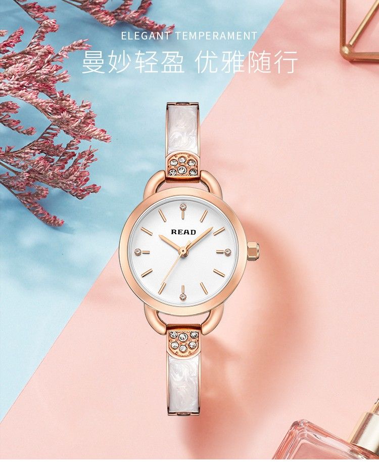 商品名称:锐力READ女士手表 小巧表盘甜美玫瑰金手链式钢带进口机芯石英女表