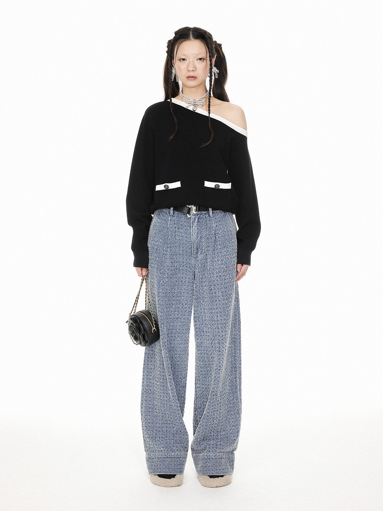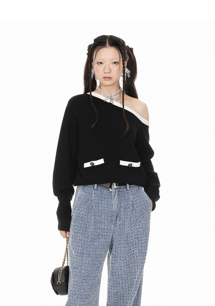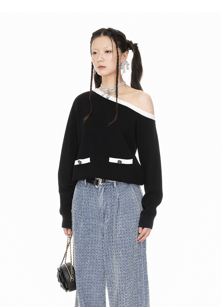 地素针织斜肩毛衫春季专柜小香风气质撞色长袖毛衣女 441419