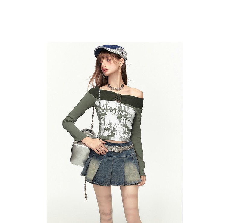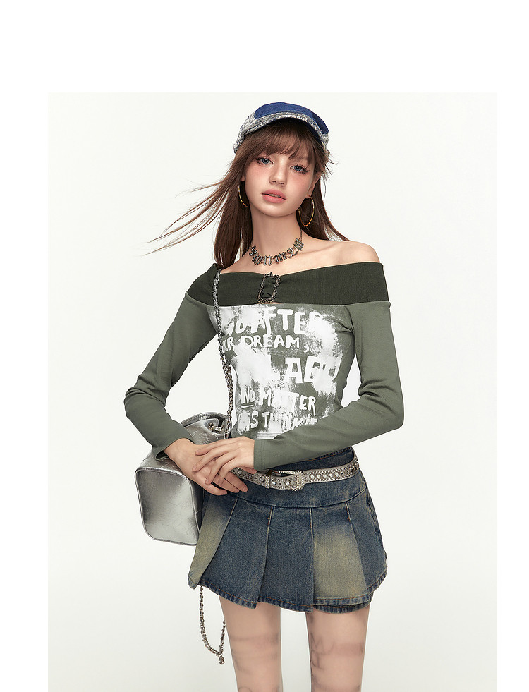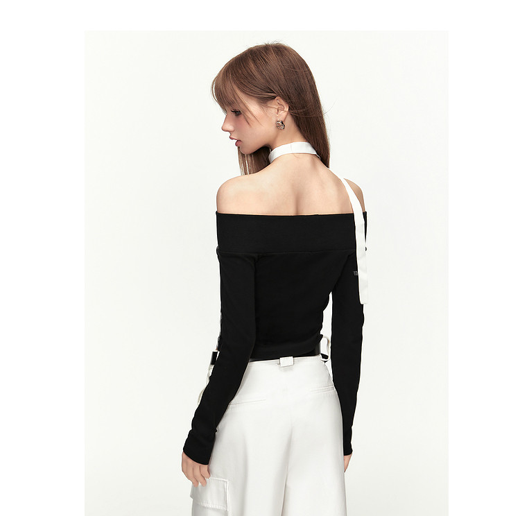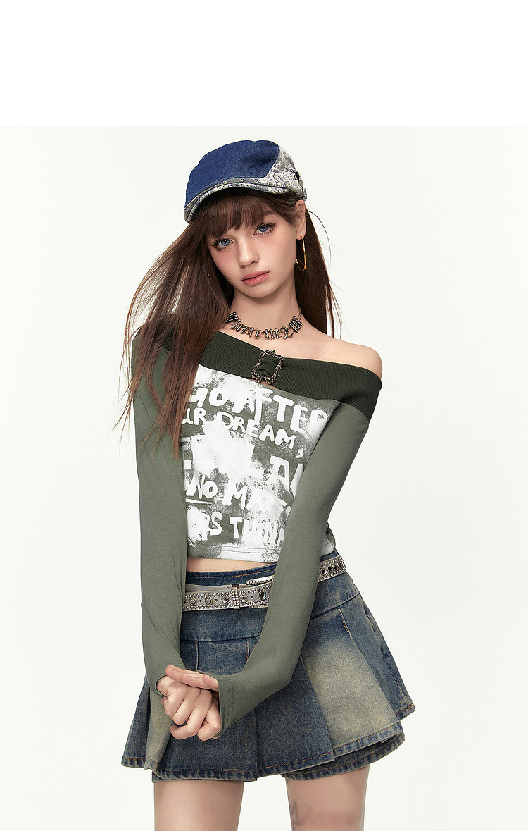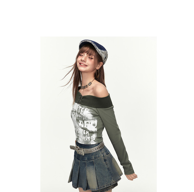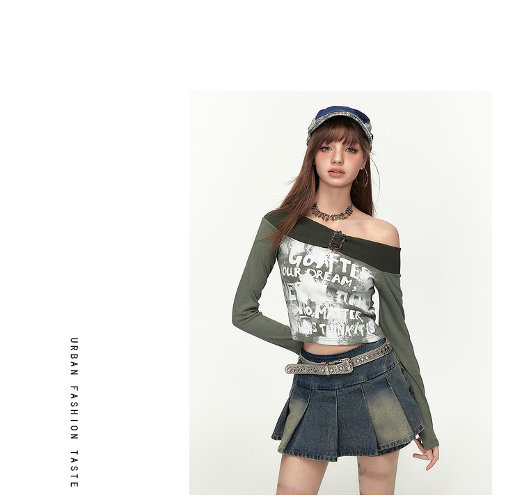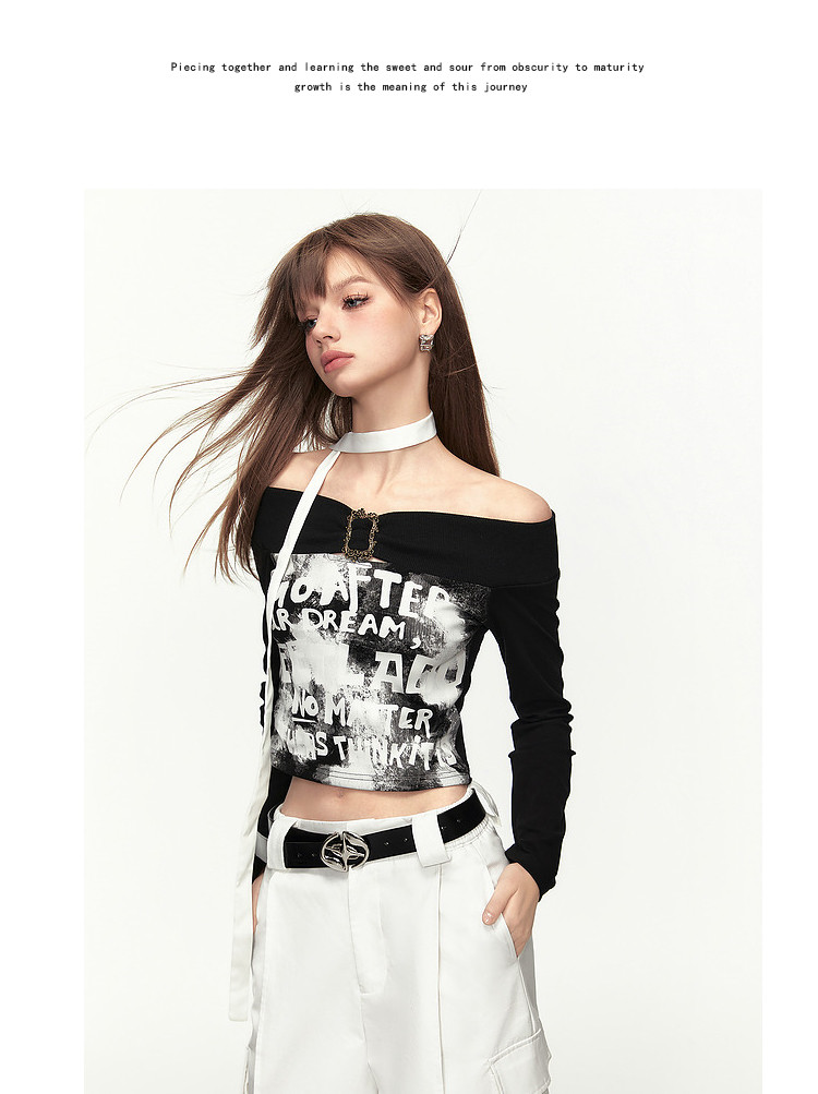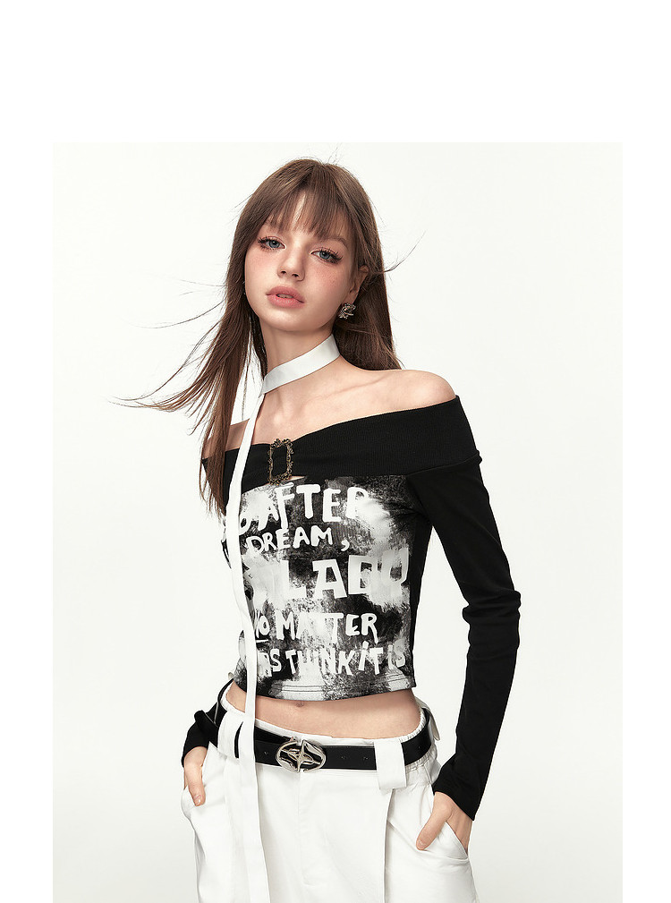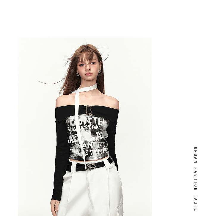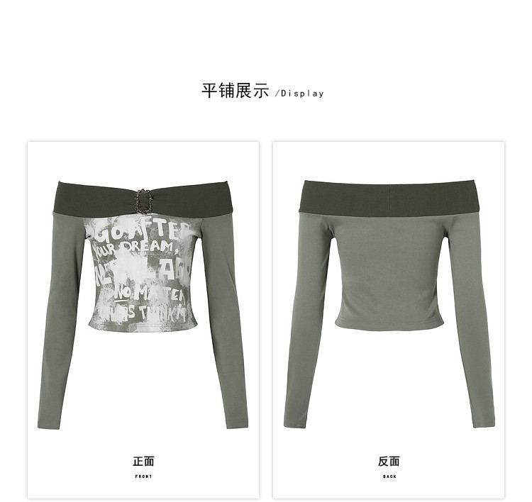 商品名称:【24春】一字肩条纹撞色字母印花长袖T恤修身短款上衣 022420