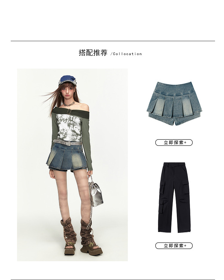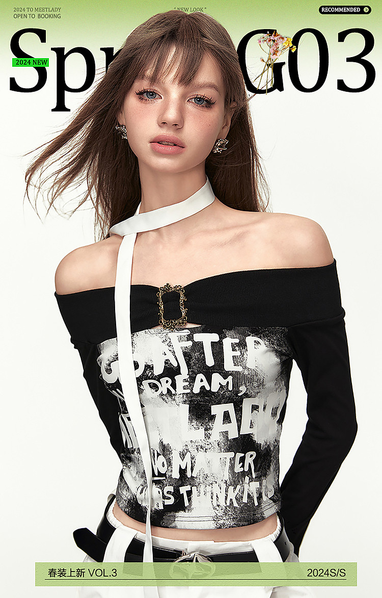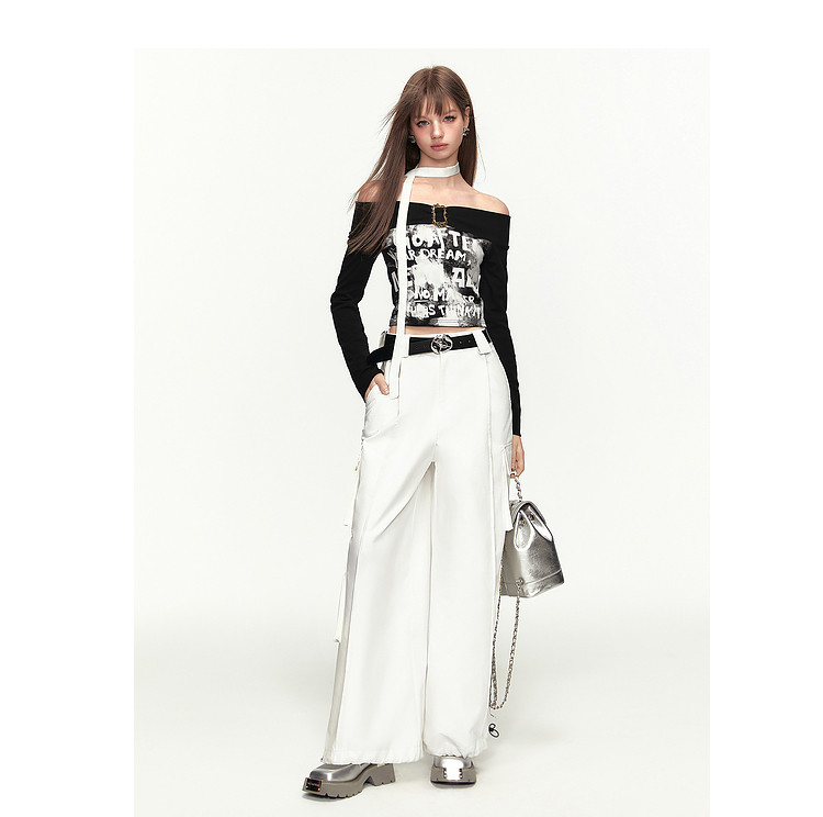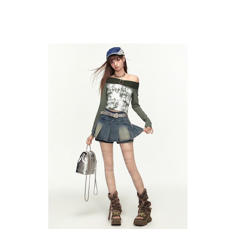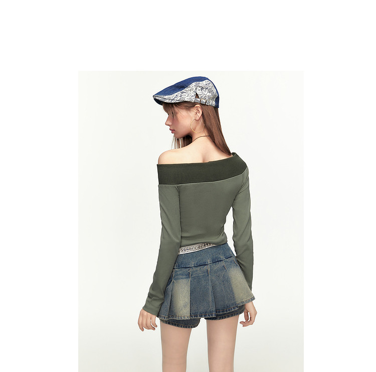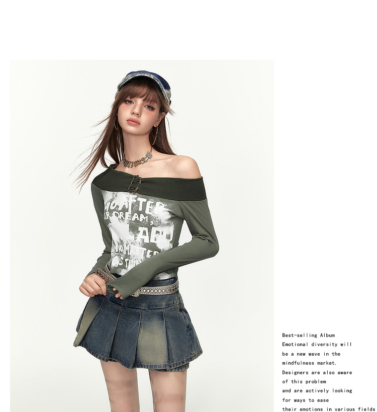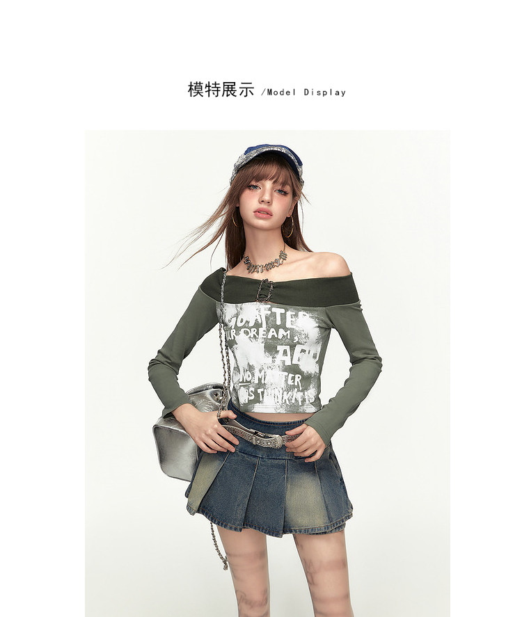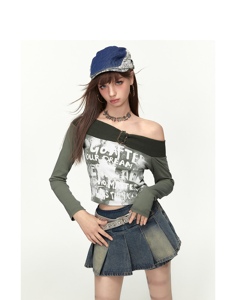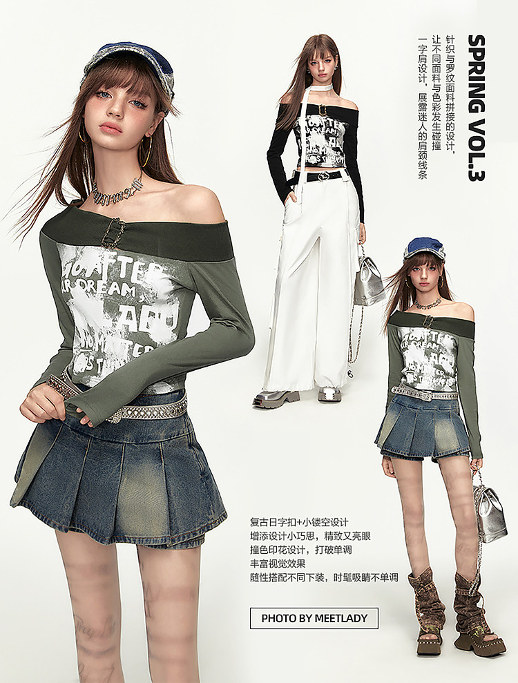 商品名称:【24春】一字肩条纹撞色字母印花长袖T恤修身短款上衣 022420