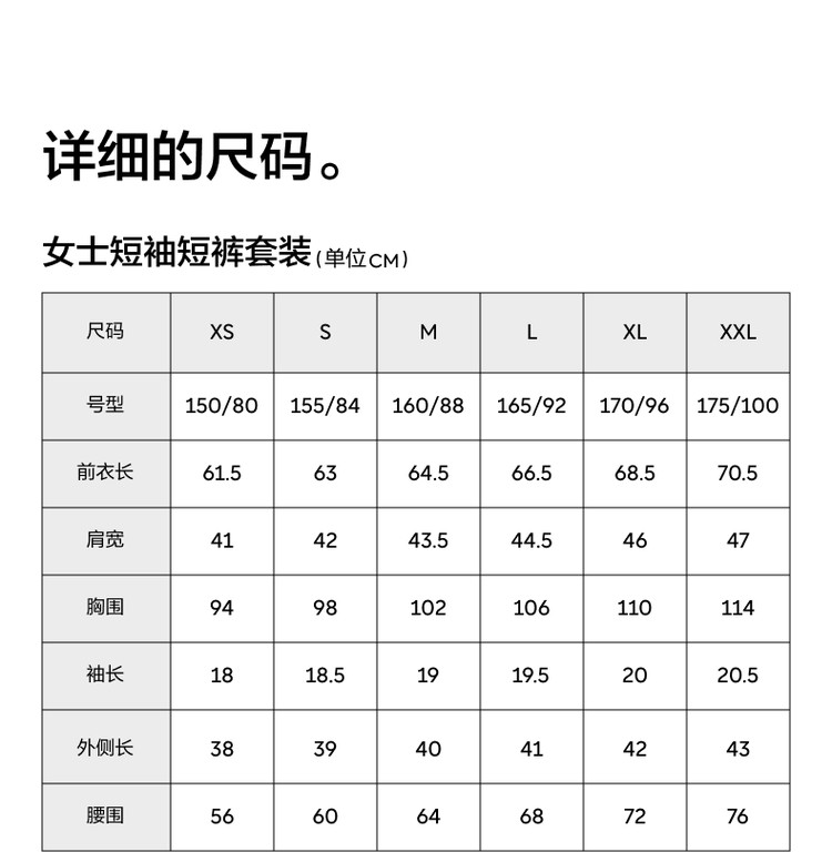 | 尺码 | 肩宽(cm) | 袖长(cm) | 衣长(cm) | 身高(cm) | 腰围(cm) | 裤长(cm) | 体重(kg) | 臀围(cm) | 胸围(cm) | 号型 |