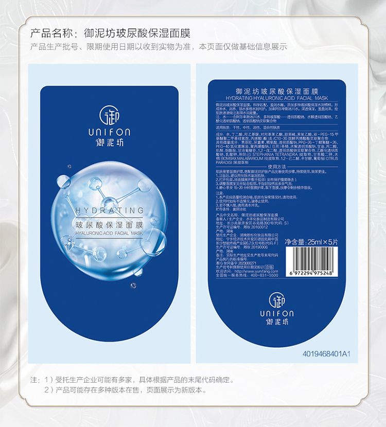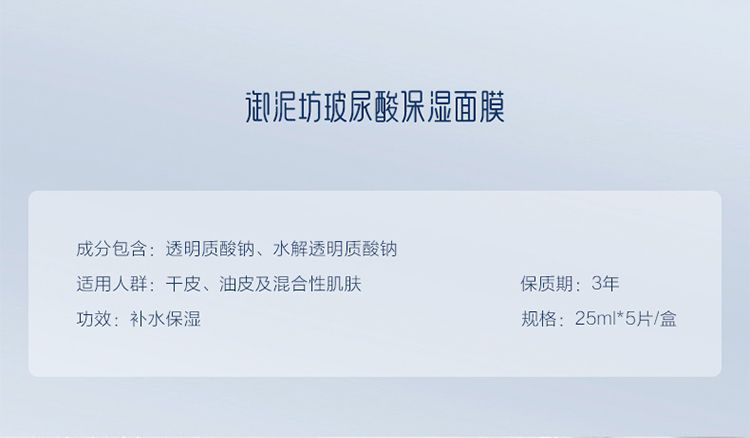 商品名称:御泥坊 玻尿酸保湿面膜25ml*5 保湿补水