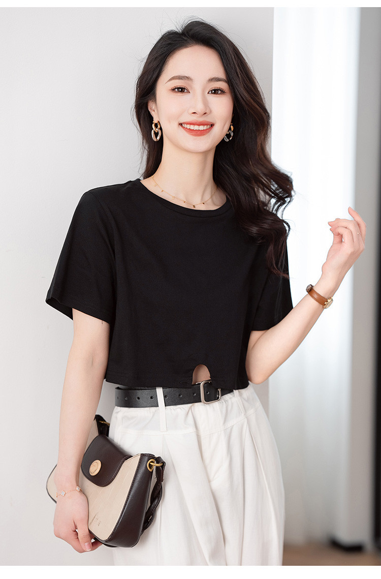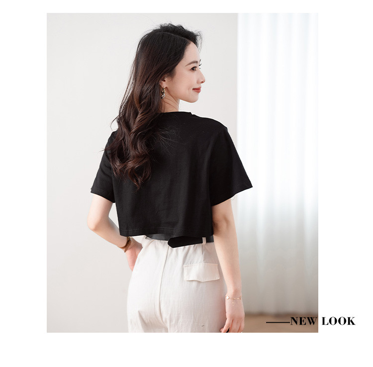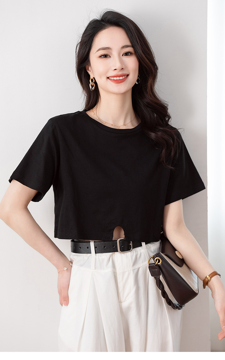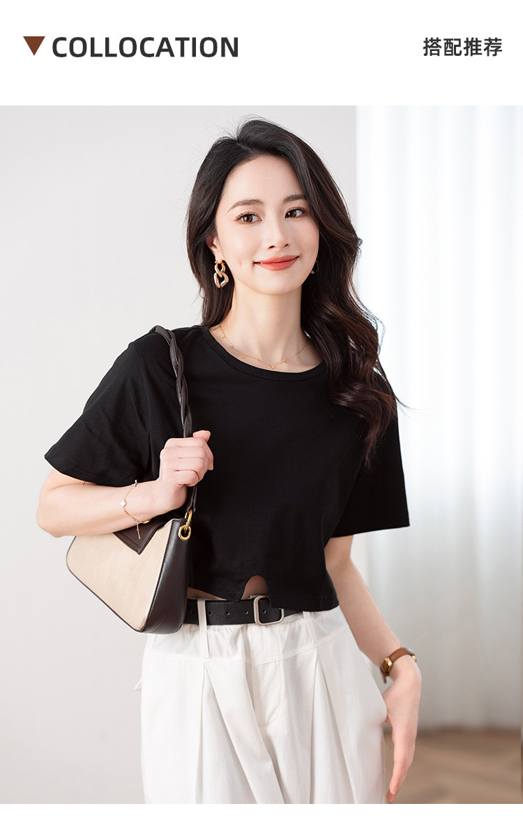 圆领短袖体恤女夏季设计感短款辣妹装圆领纯色t恤上衣 079576
