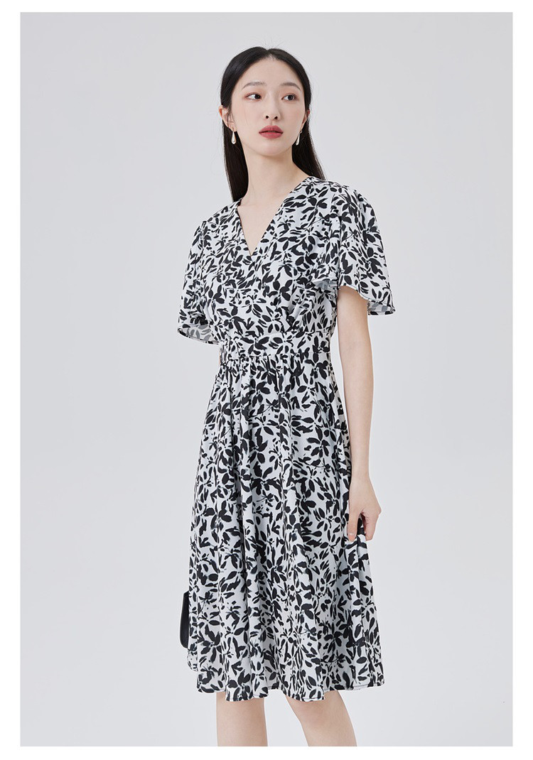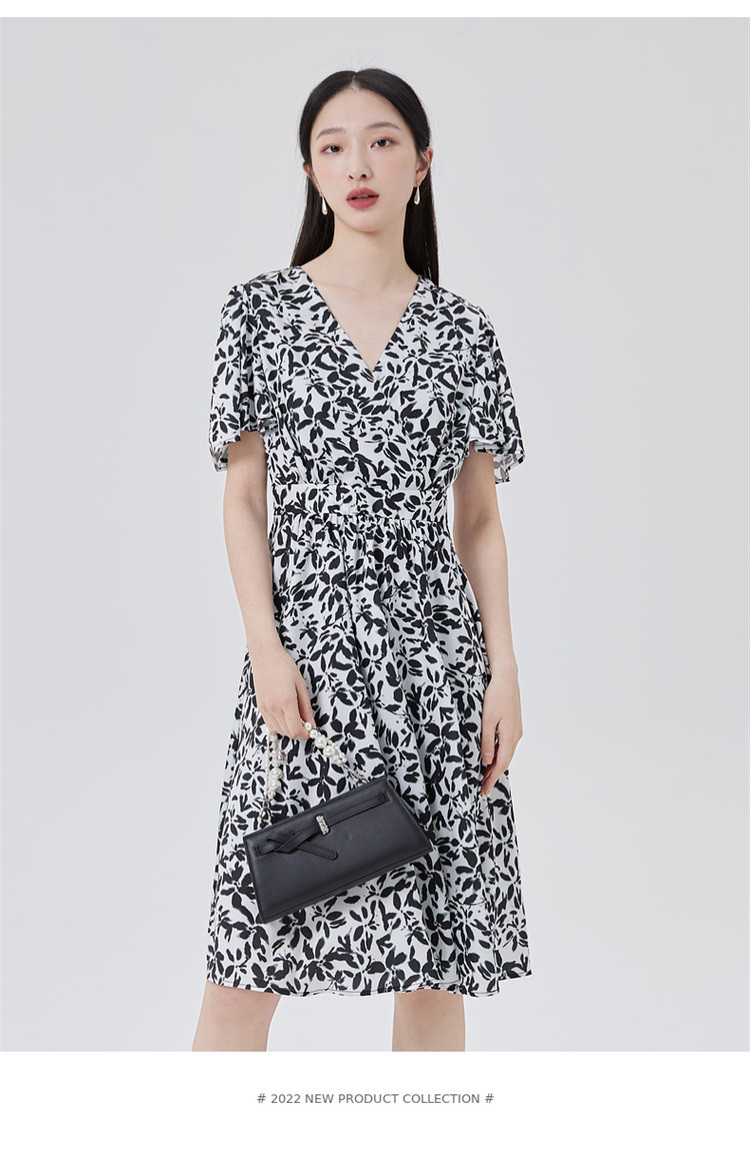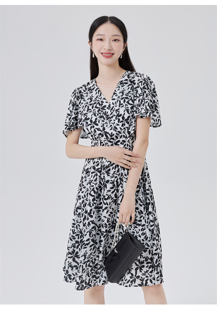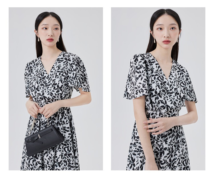 商品名称:【商场同款】高级气质V领连衣裙收腰显瘦A字长裙子女夏季短袖 383574