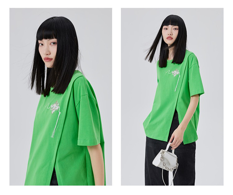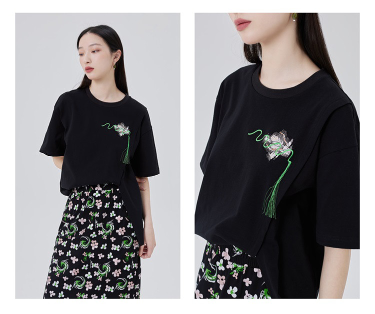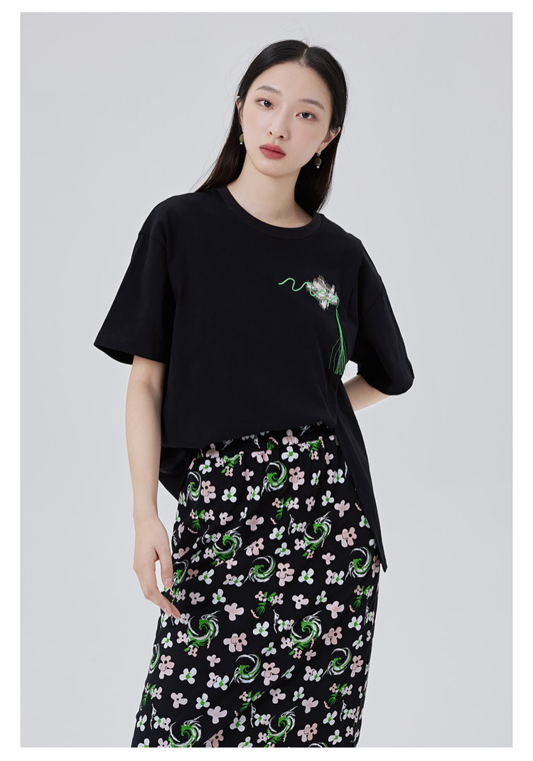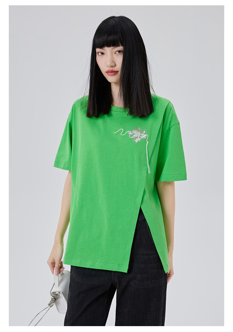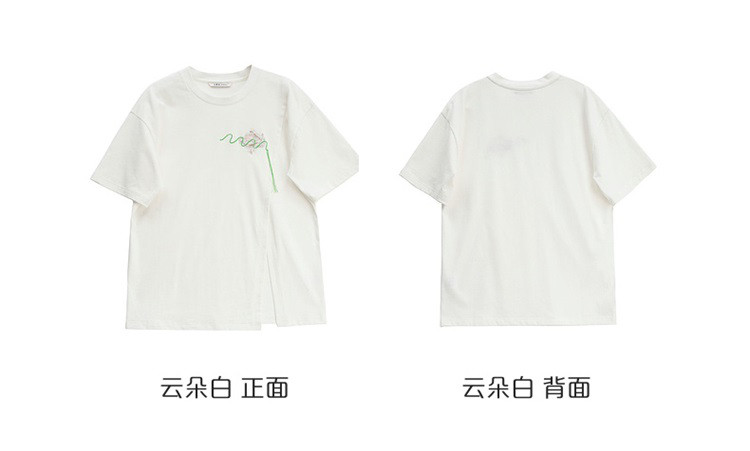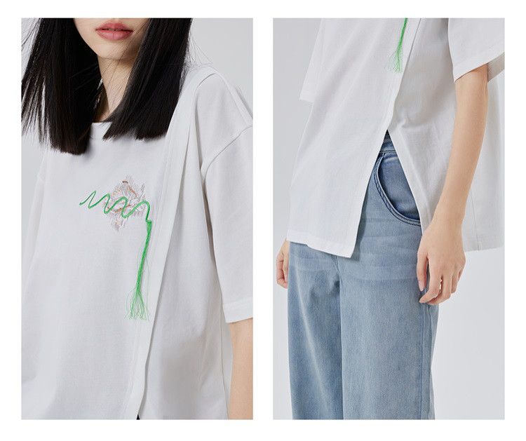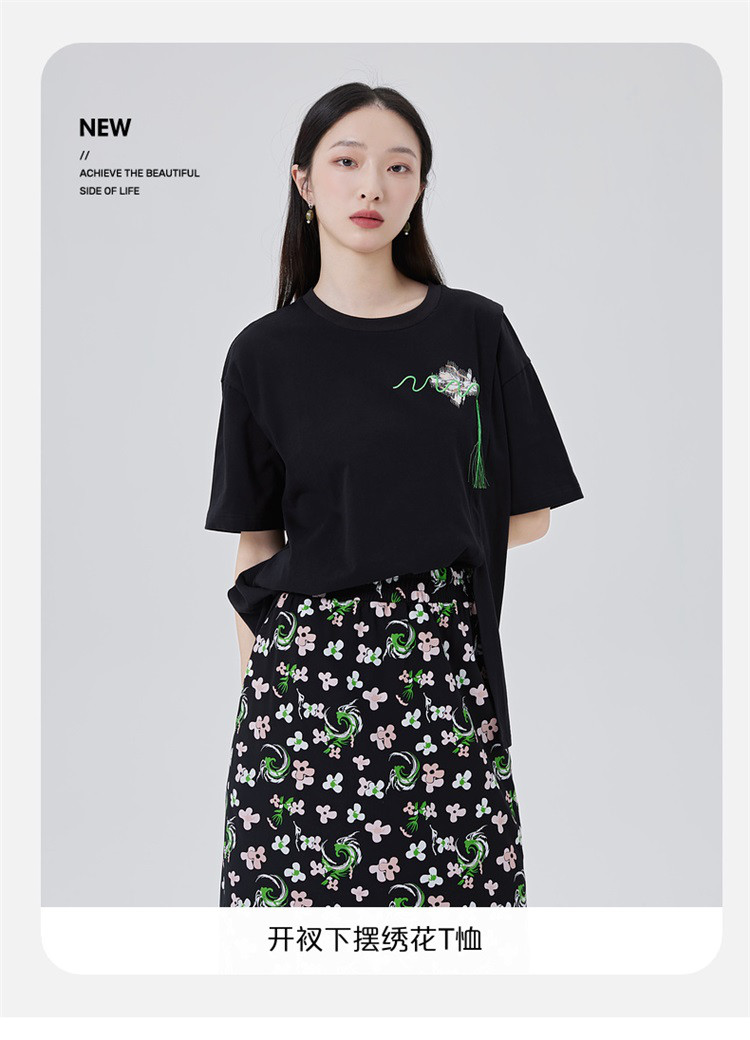 商品名称:【商场同款】100%纯棉短袖女时尚开衩下摆绣花T恤女中长款 201238