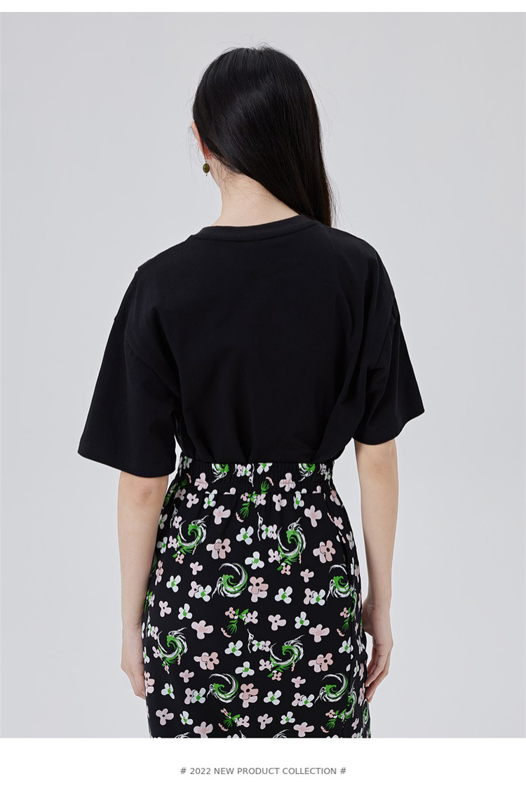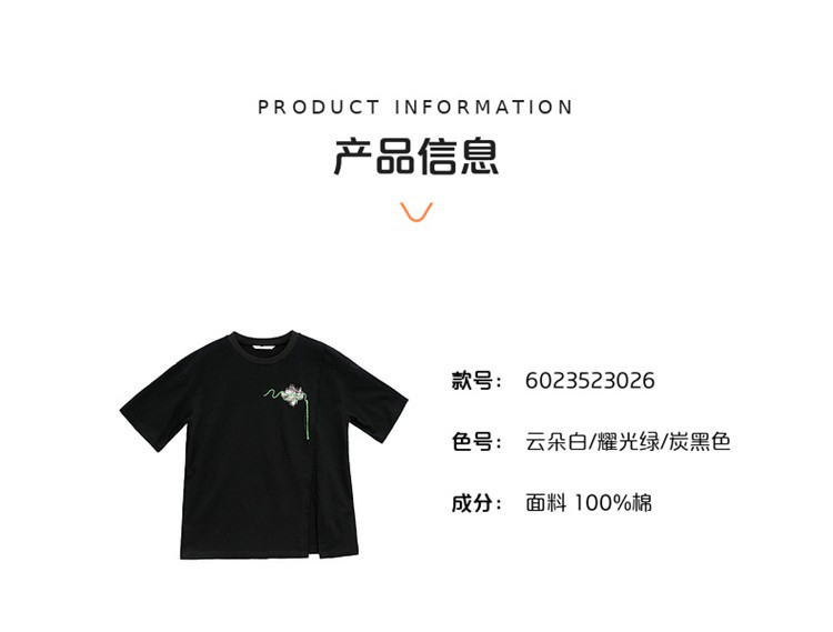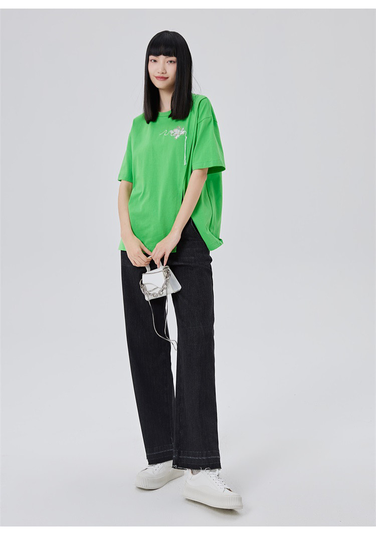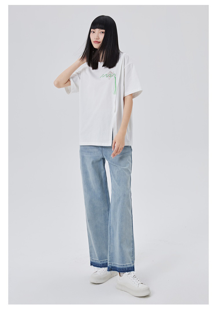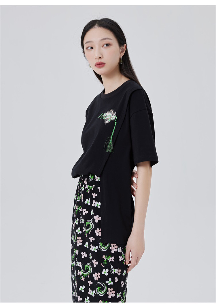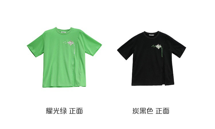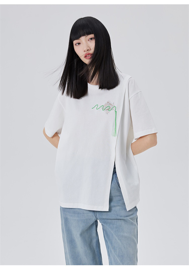商品名称:【商场同款】100%纯棉短袖女时尚开衩下摆绣花T恤女中长款 201238