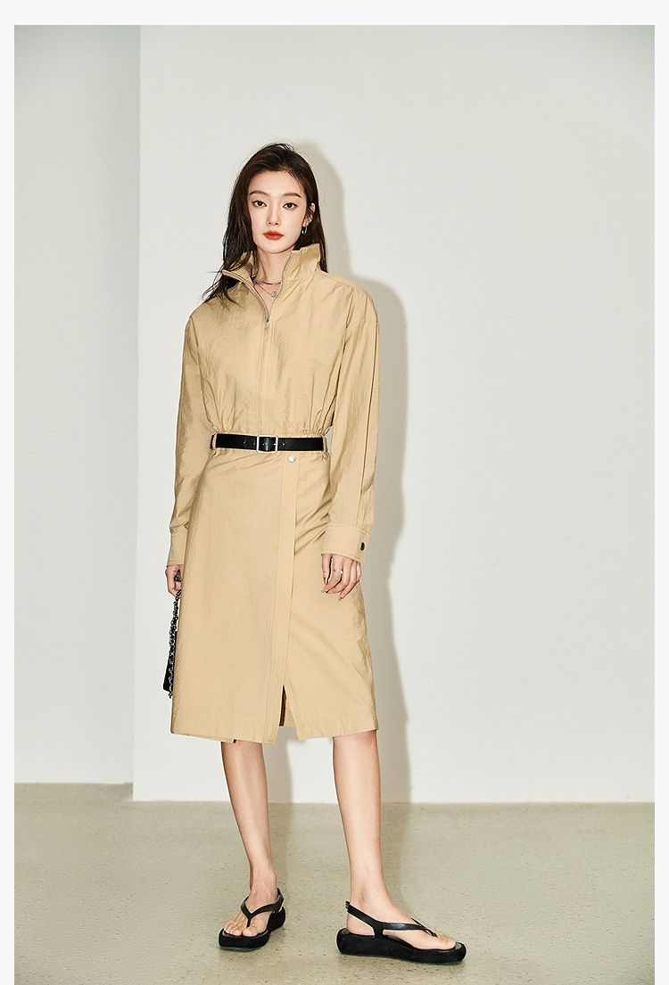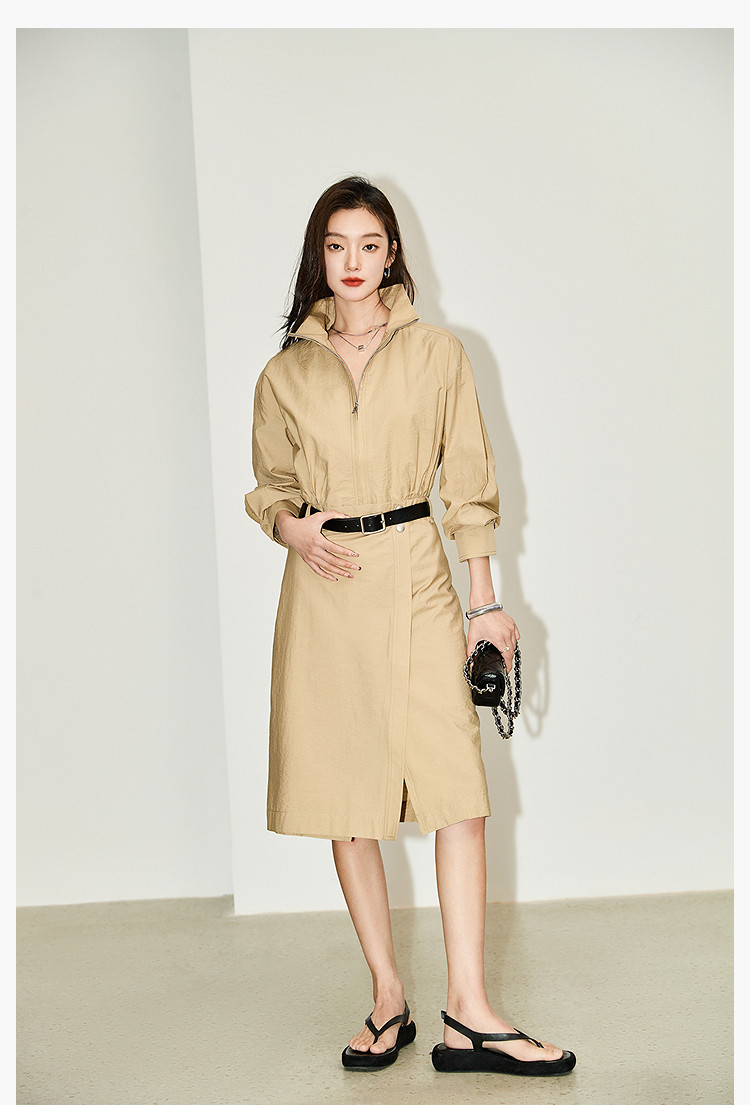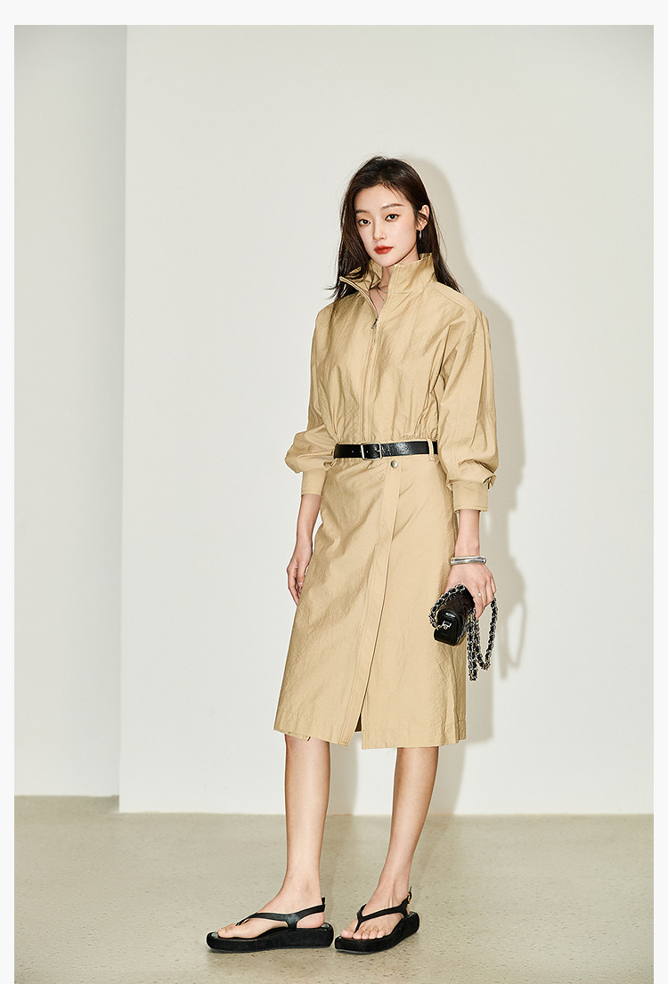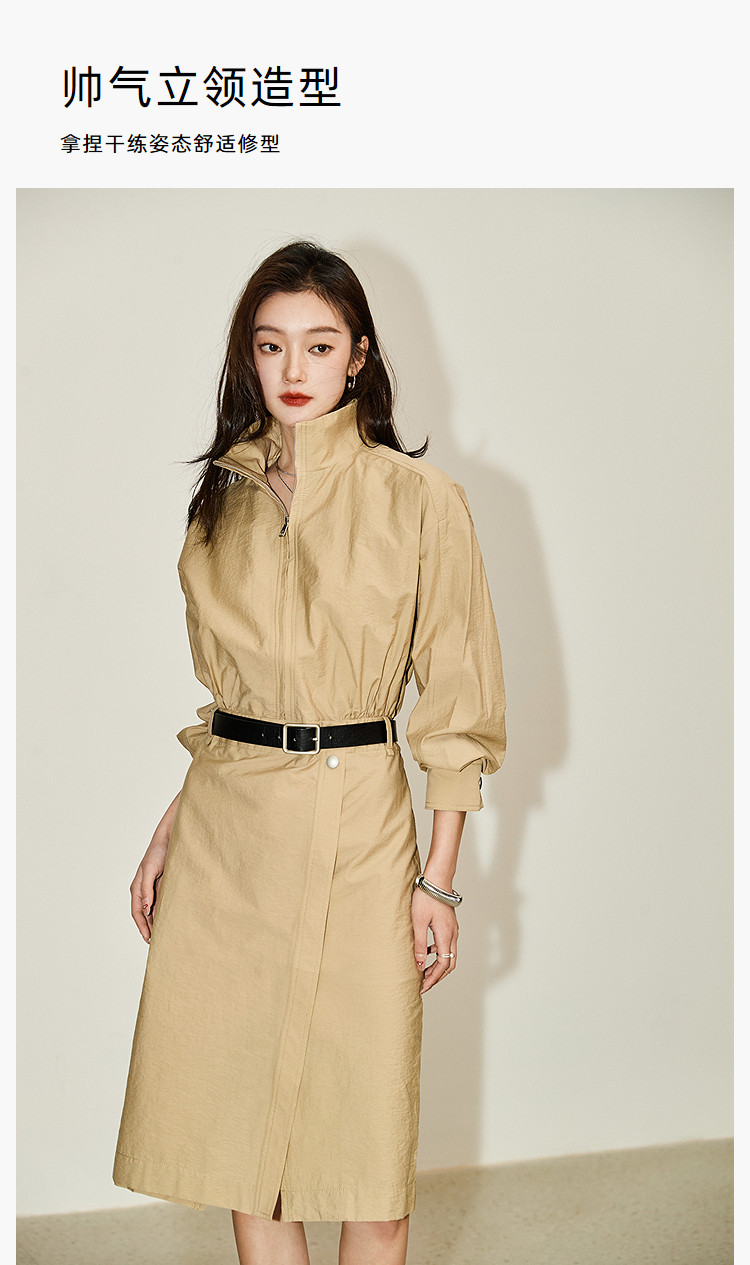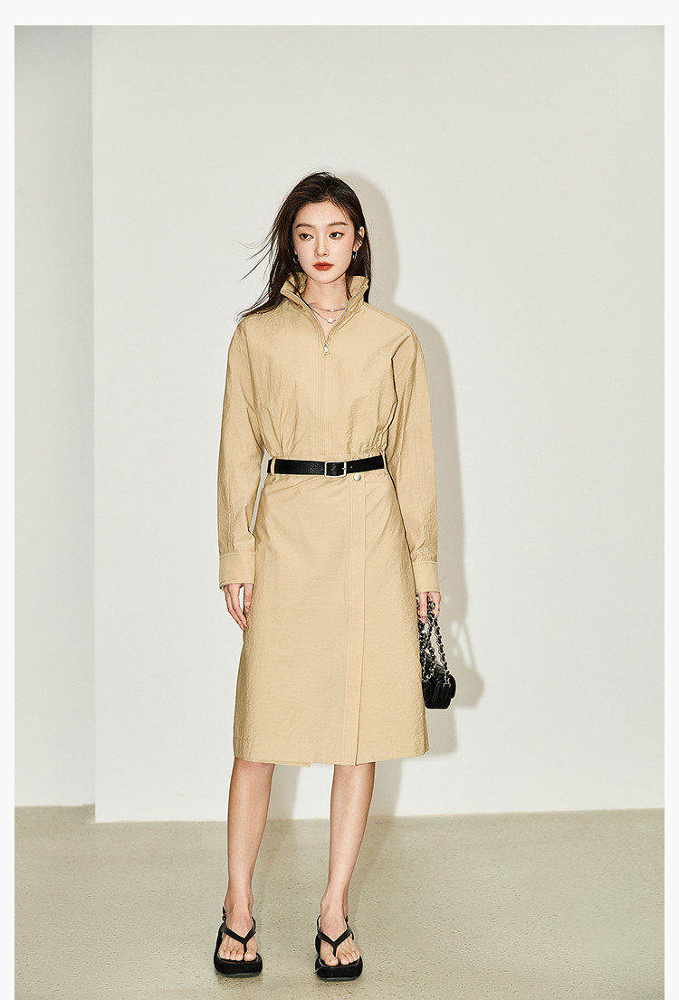 时尚都市通勤款纯色显瘦长款高腰风衣式连衣裙 156827