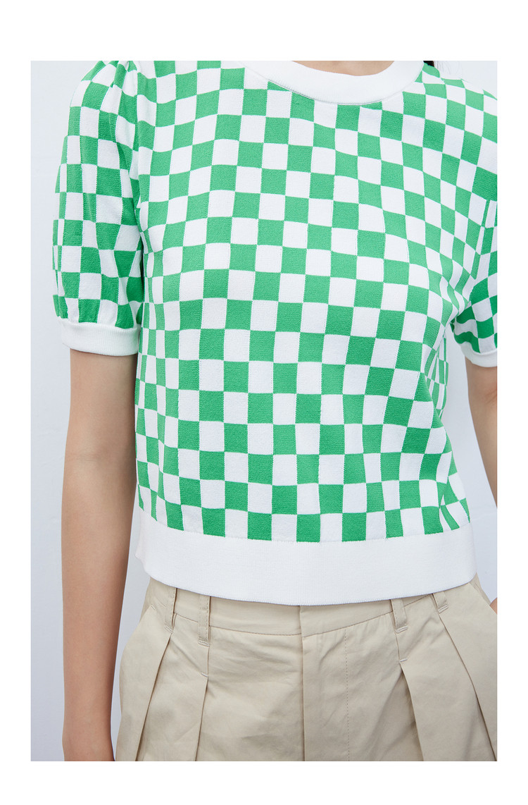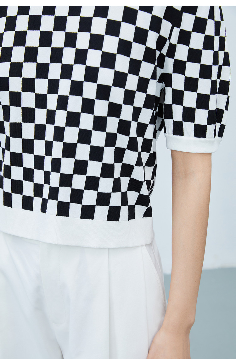 【商场同款】春季款复古棋盘格纹短袖毛针织衫小上衣 892891