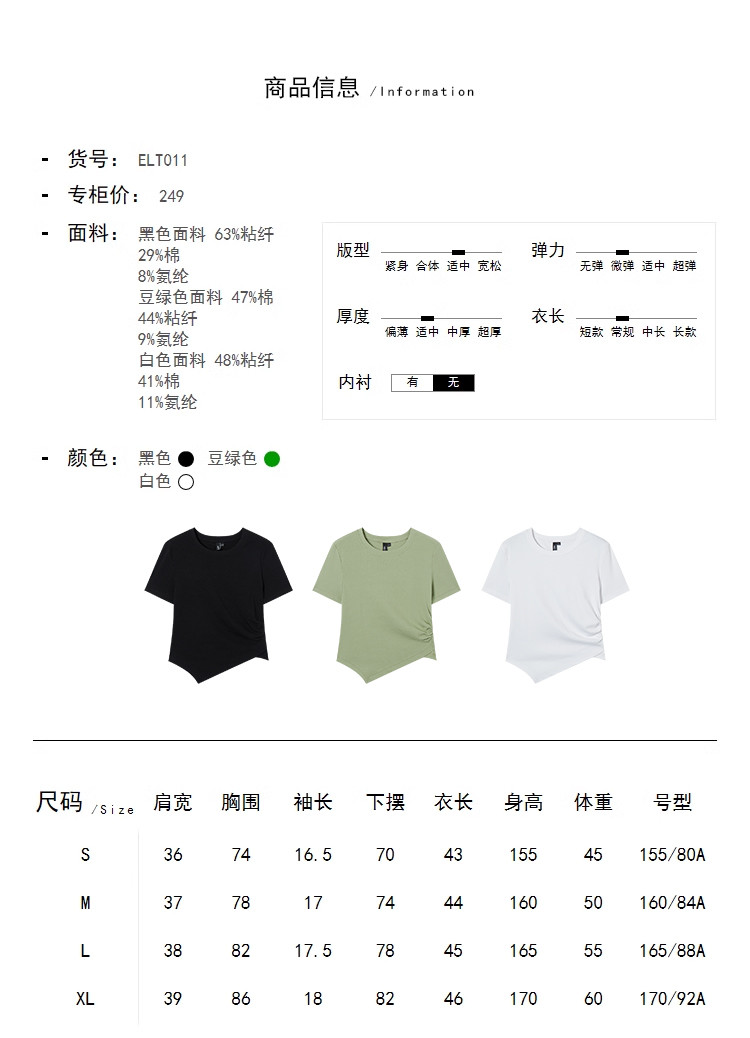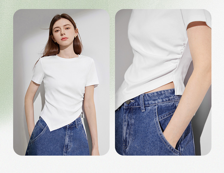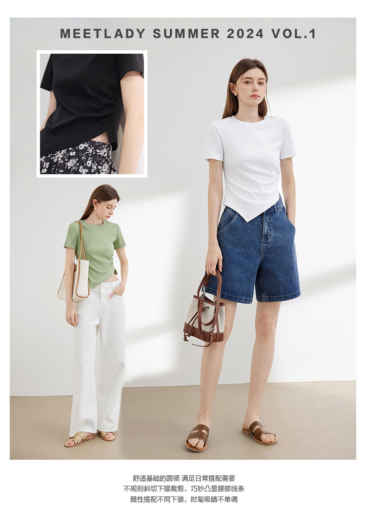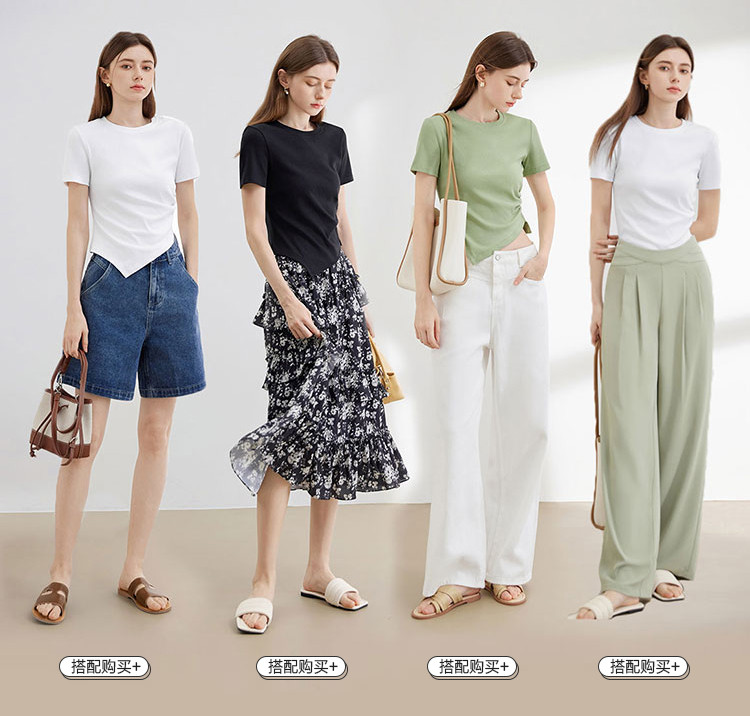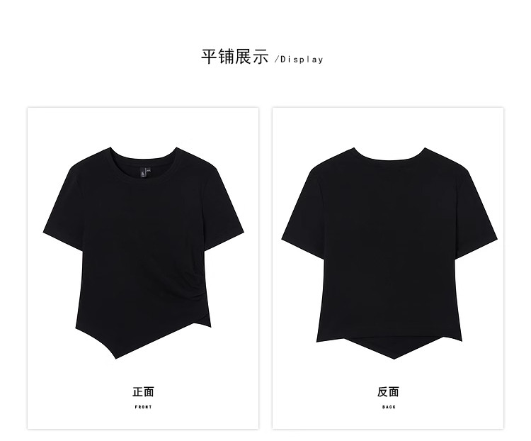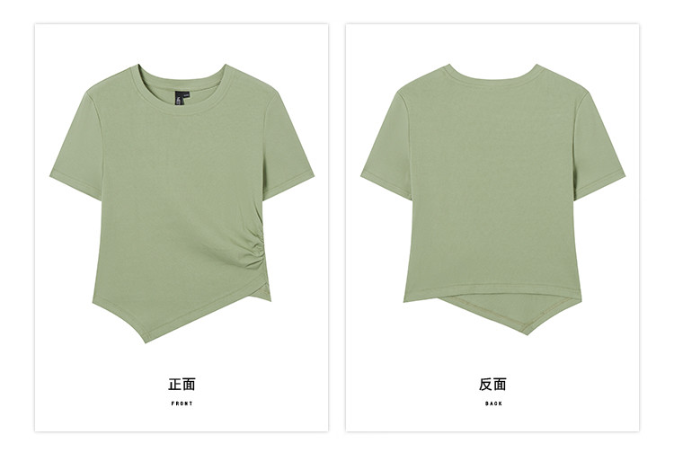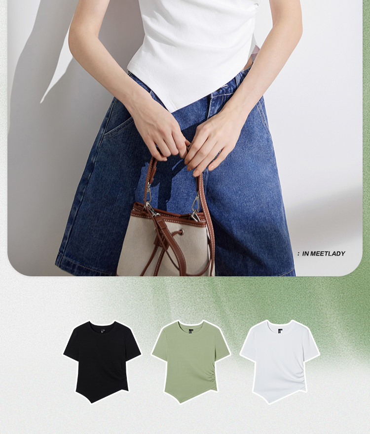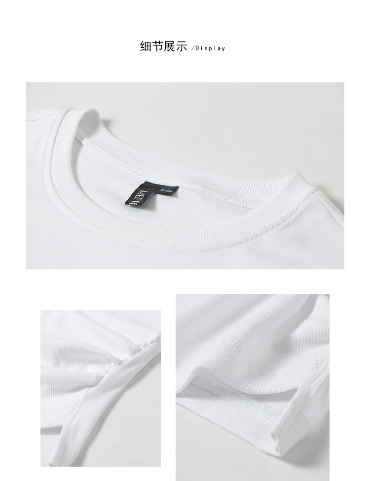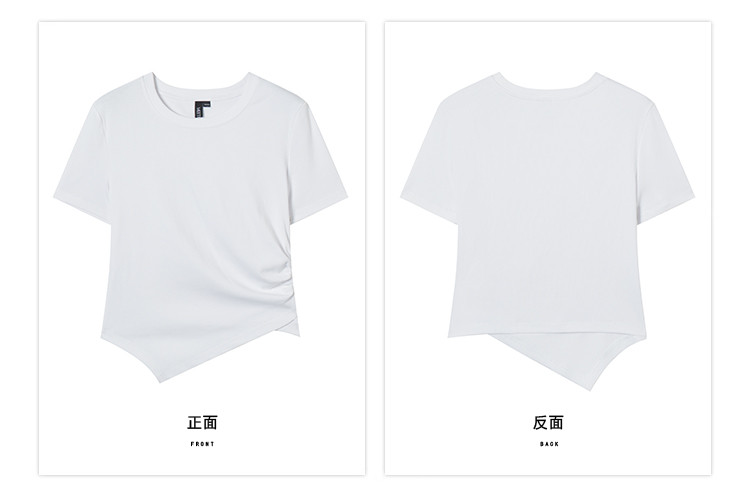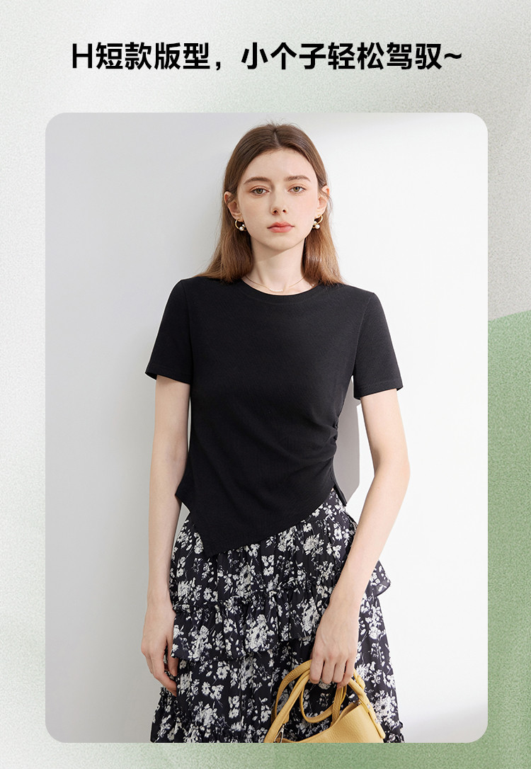 商品名称:夏季热卖收腰圆领短袖t恤女简约设计感纯色显瘦上衣 083540