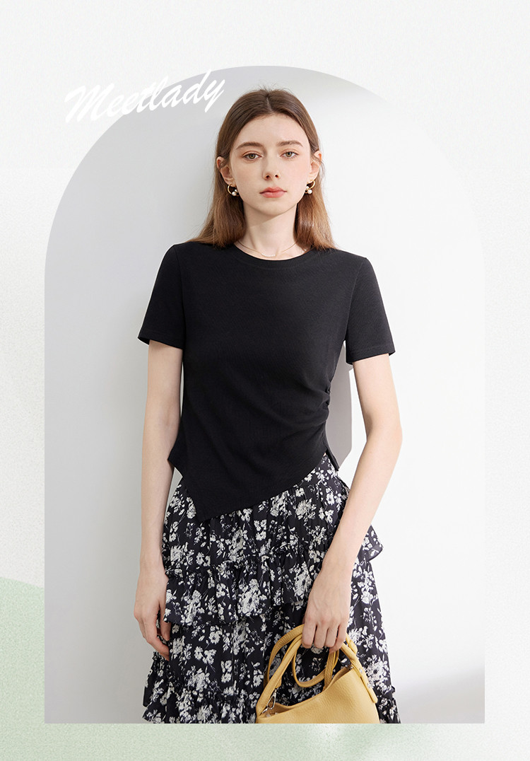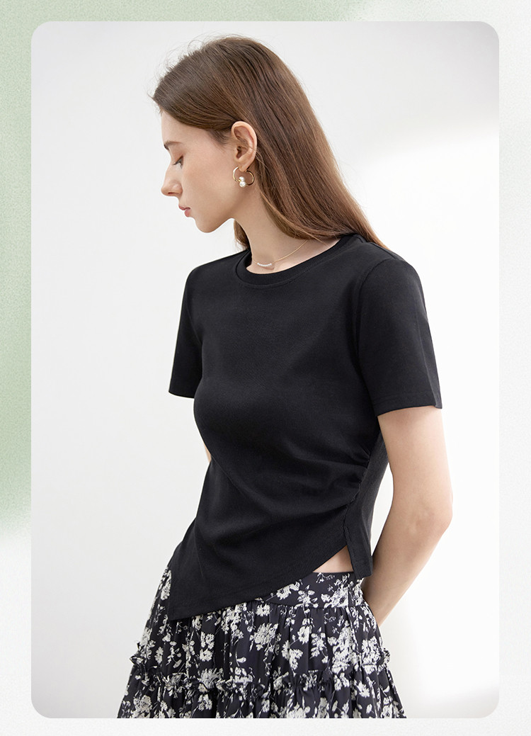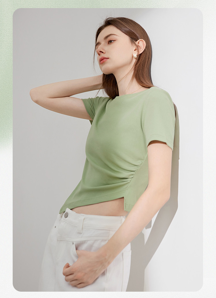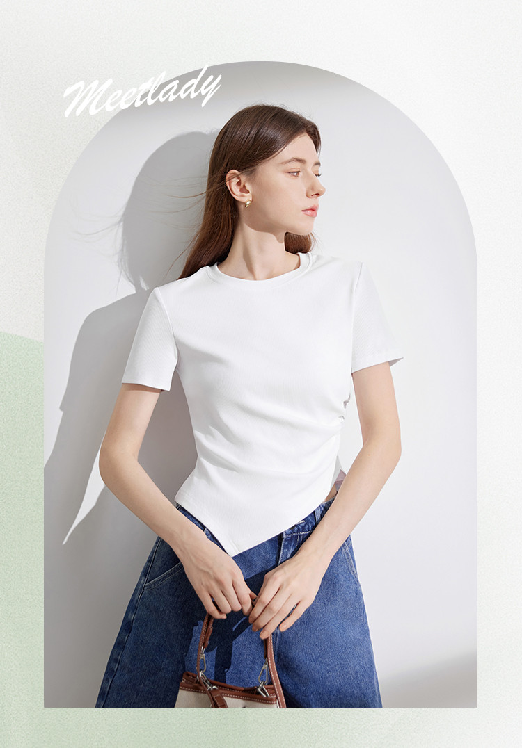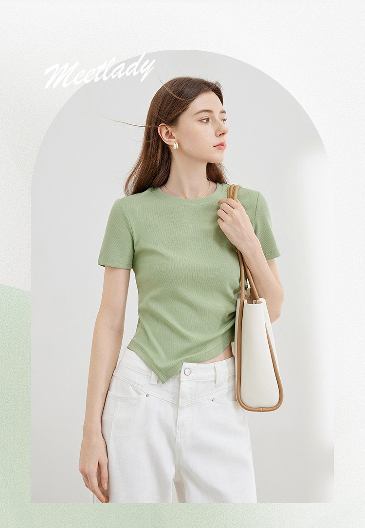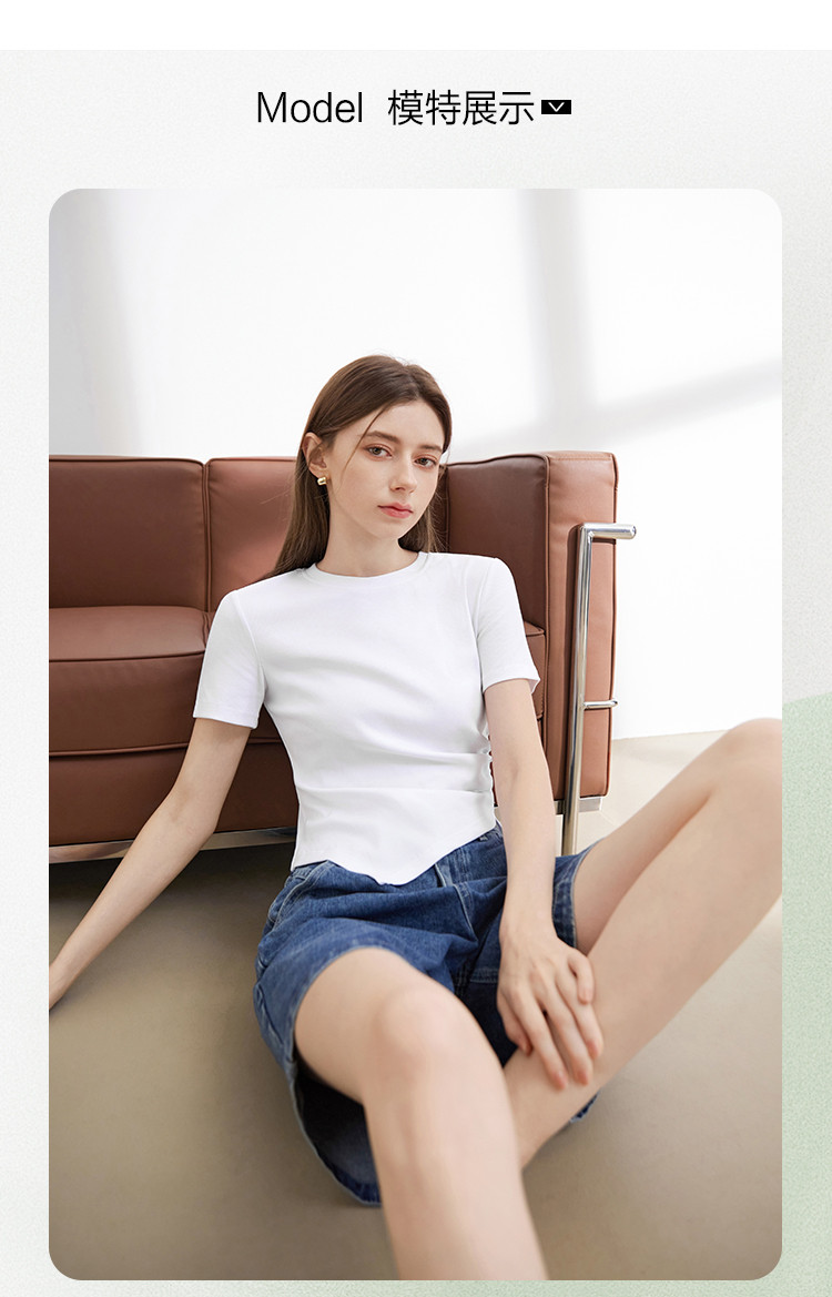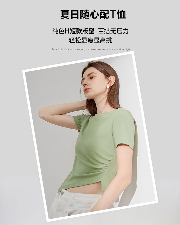 夏季热卖收腰圆领短袖t恤女简约设计感纯色显瘦上衣 083540