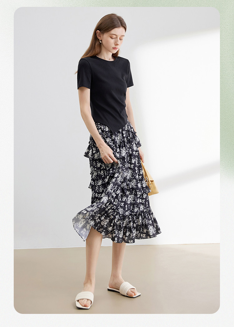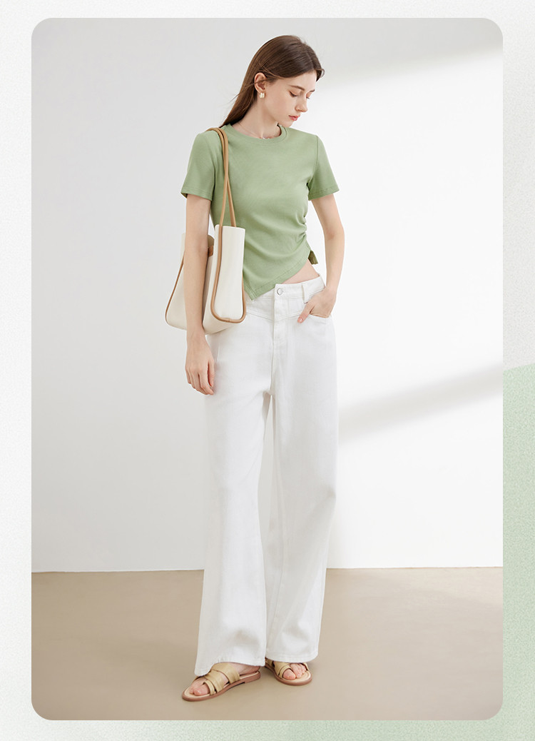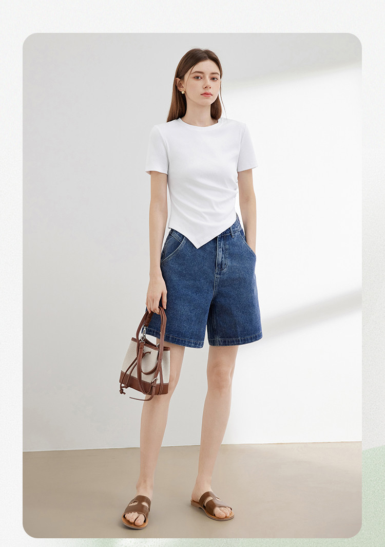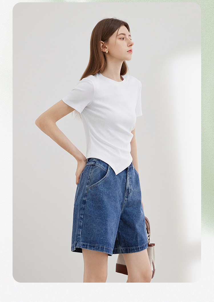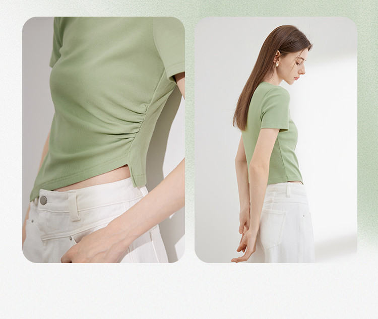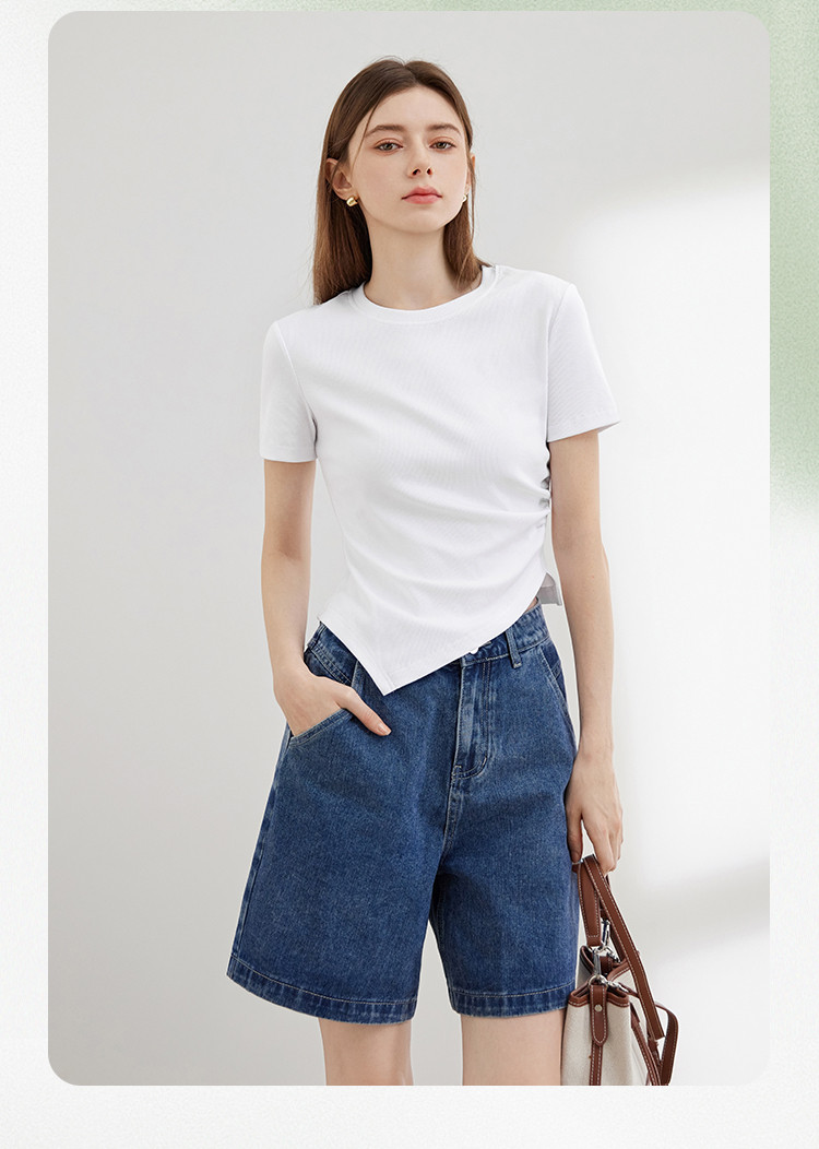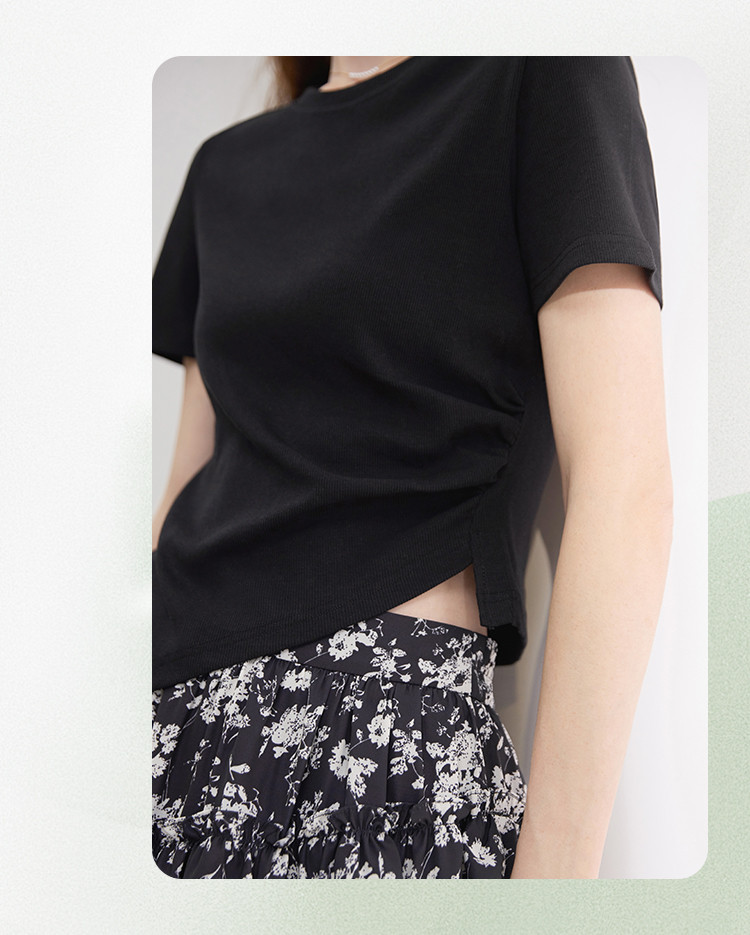 夏季热卖收腰圆领短袖t恤女简约设计感纯色显瘦上衣 083540