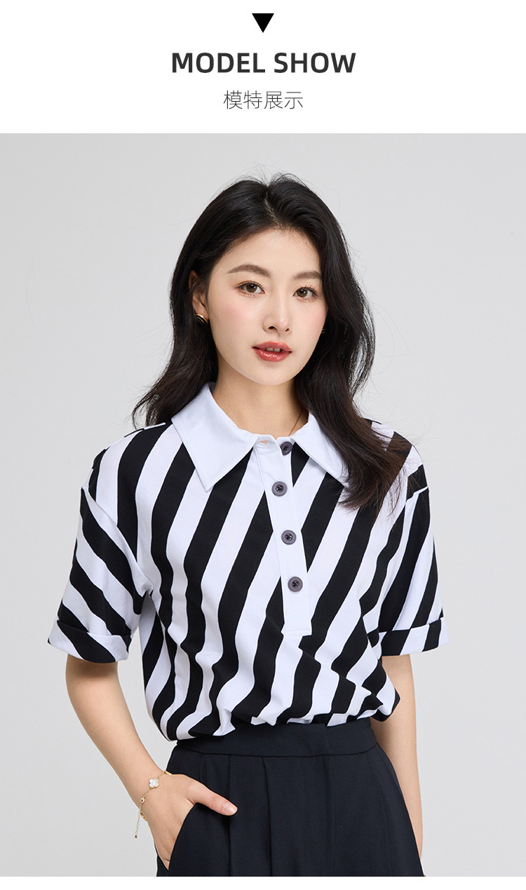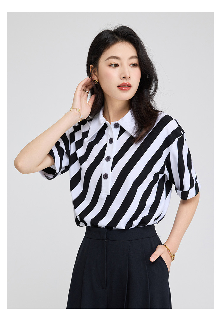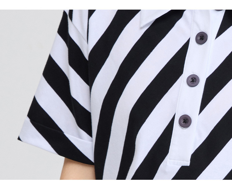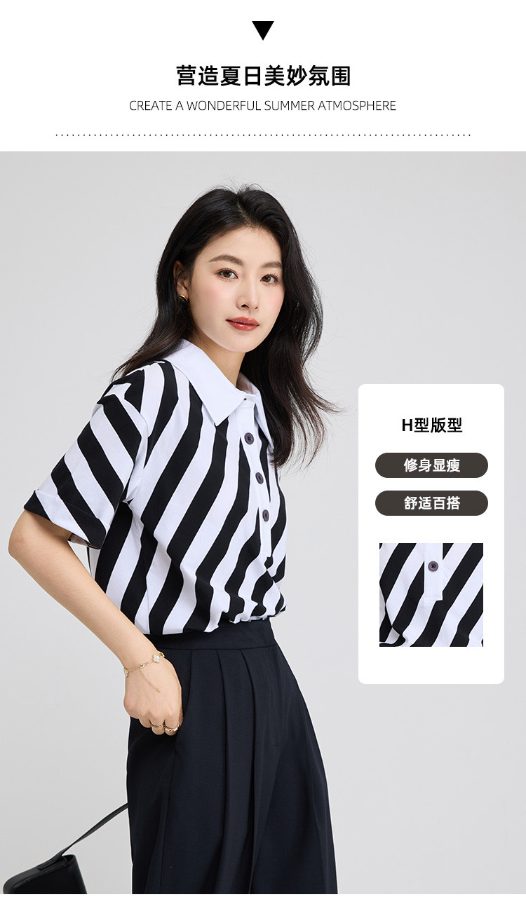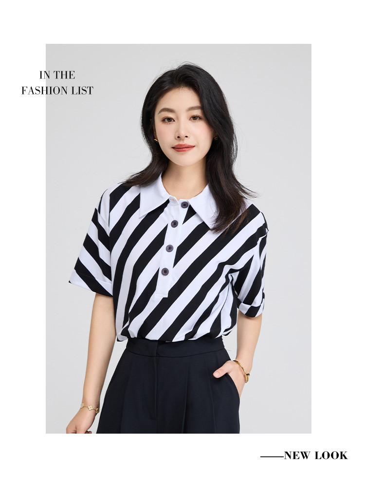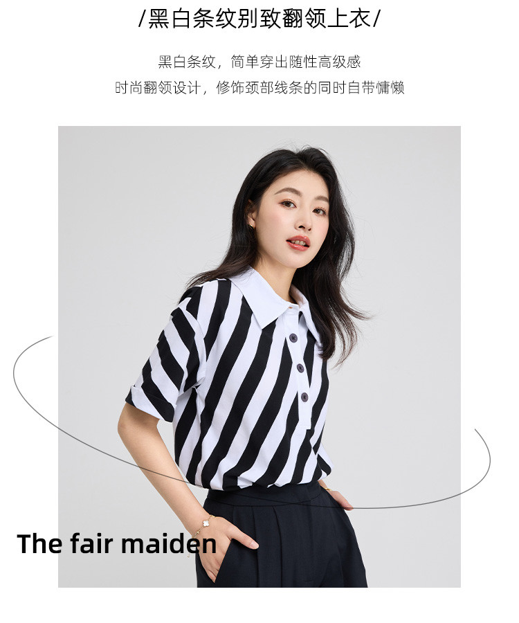 商品名称:黑白条纹短袖t恤女夏季polo衫宽松别致翻领上衣 911320
