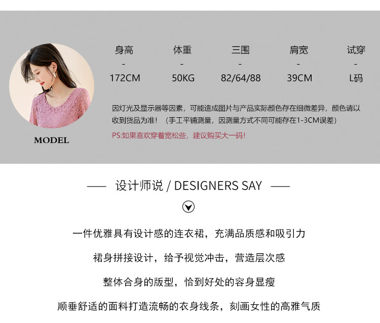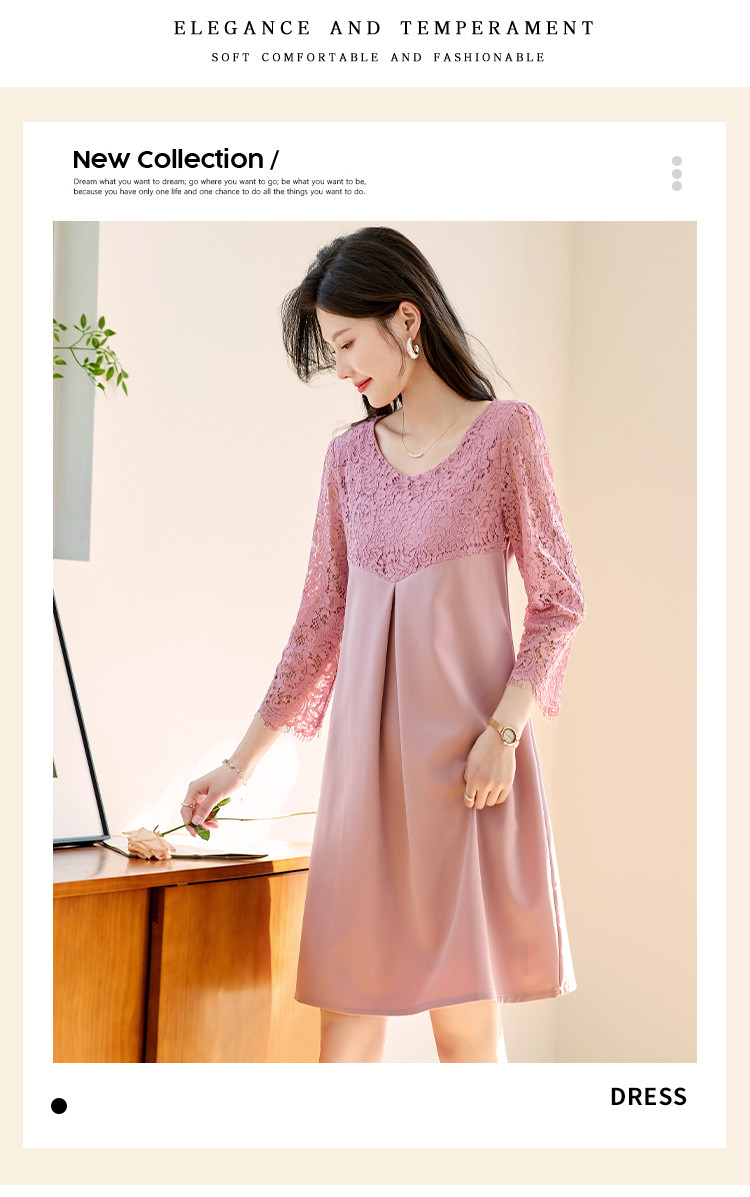 商品名称:春装七分袖女装蕾丝拼接修身显瘦气质休闲连衣裙 458456
