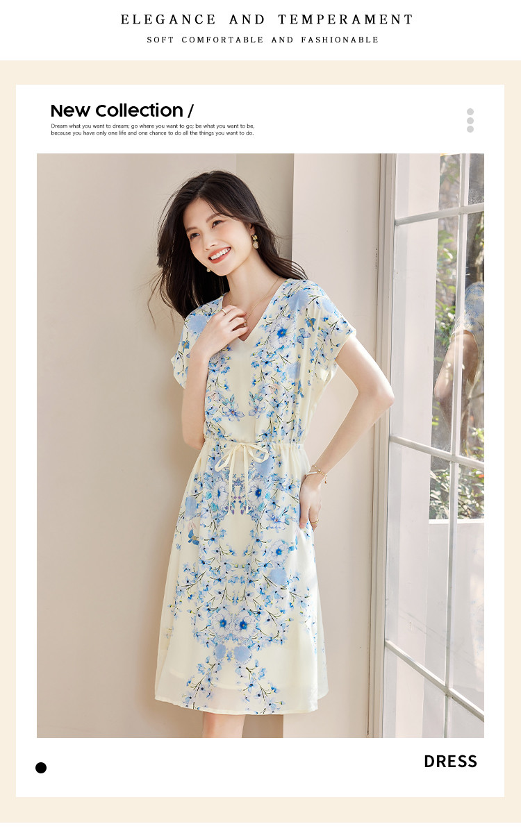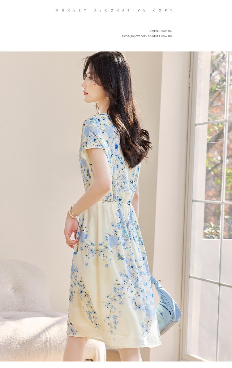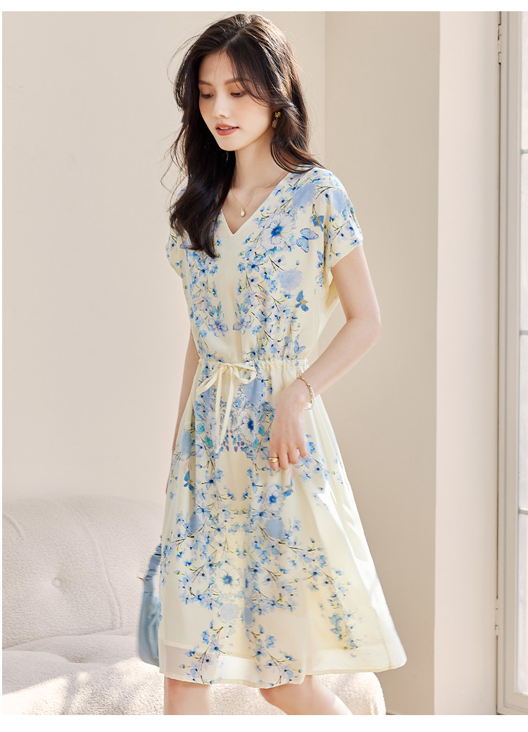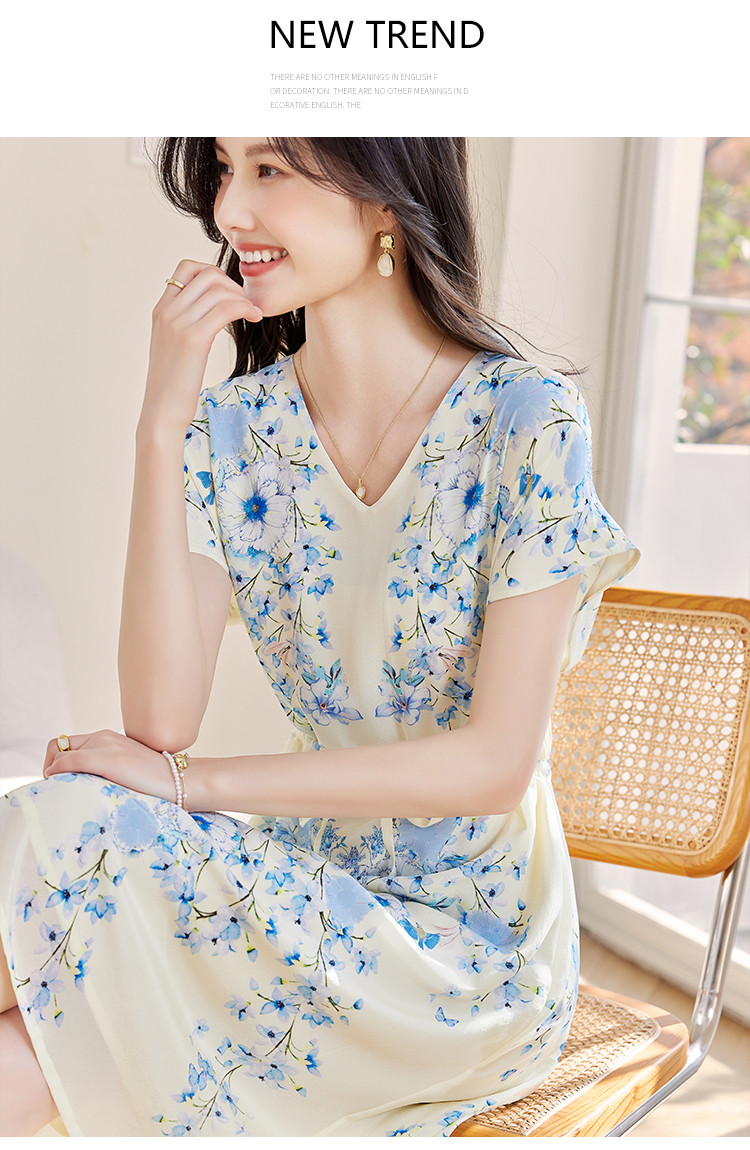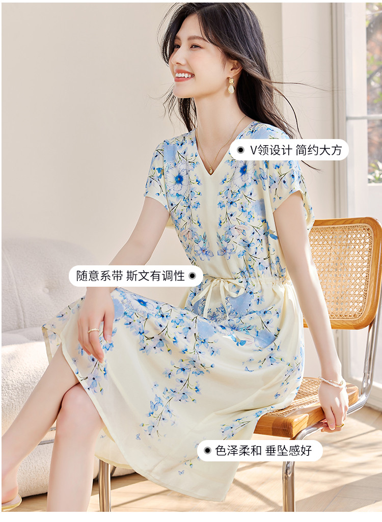 商品名称:2025春夏女装清新印花优雅时尚淑女V领真丝桑蚕丝连衣裙 533976