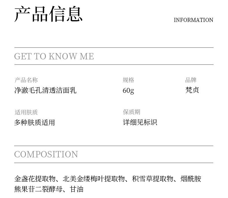 商品名称:梵贞 净澈毛孔清透洁面乳60g 滋润补水保湿洗面奶