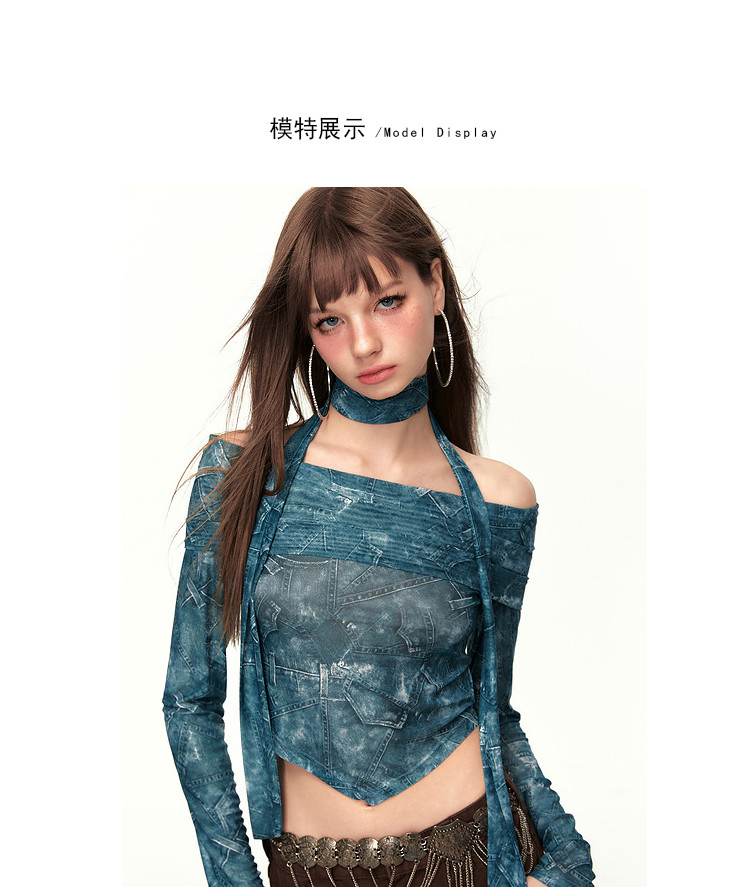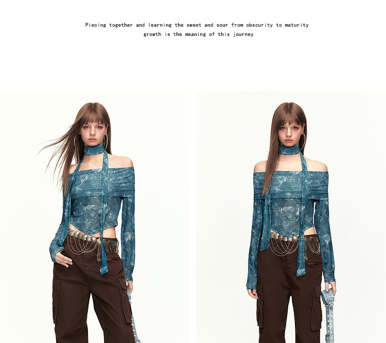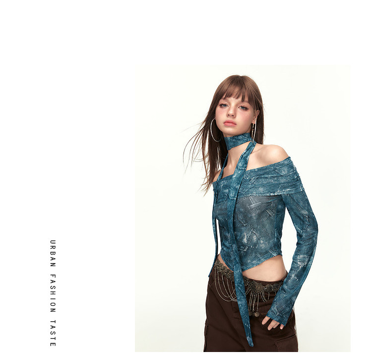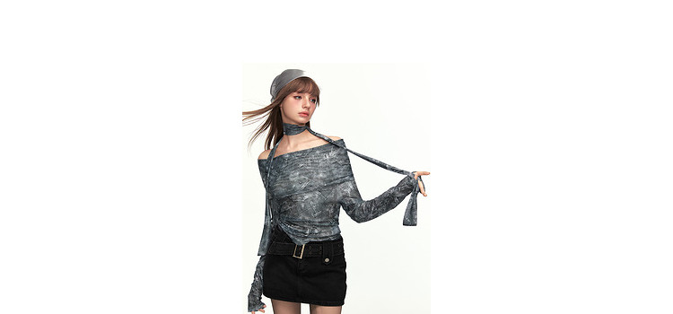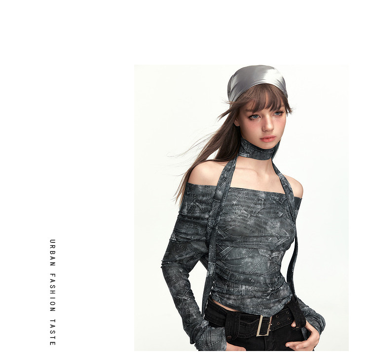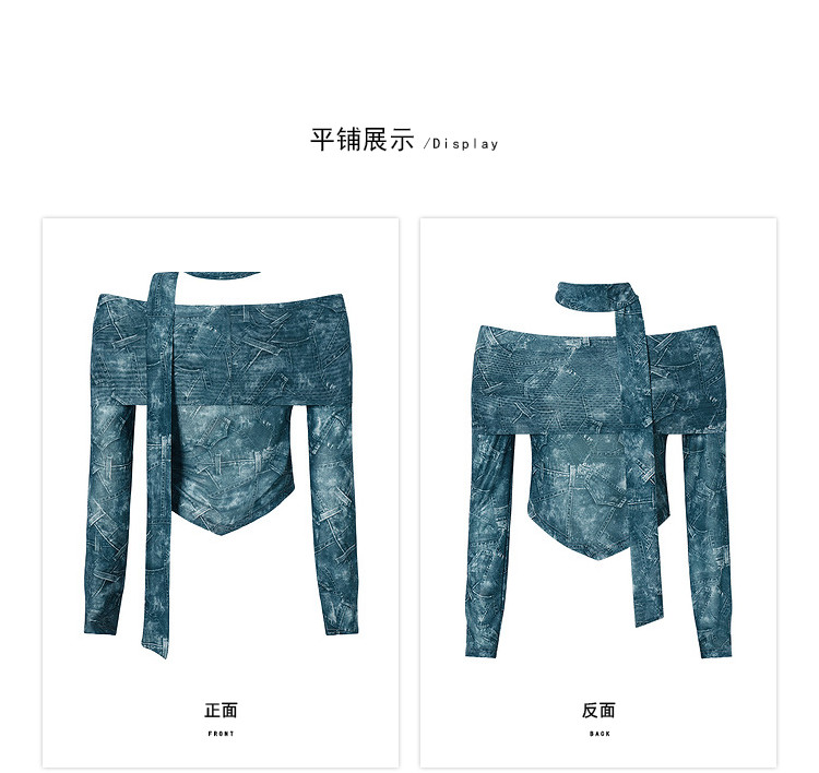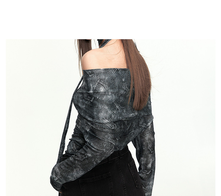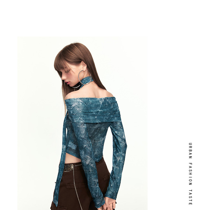 商品名称:【2024春季】甜酷风印花不规则长袖T恤女一字肩修身打底上衣 284180