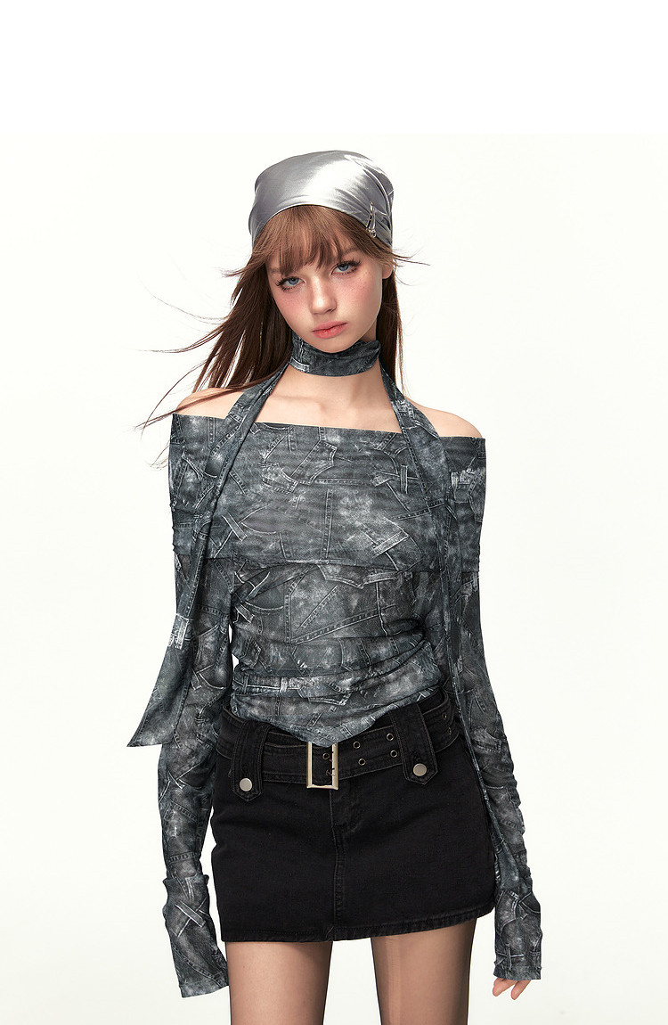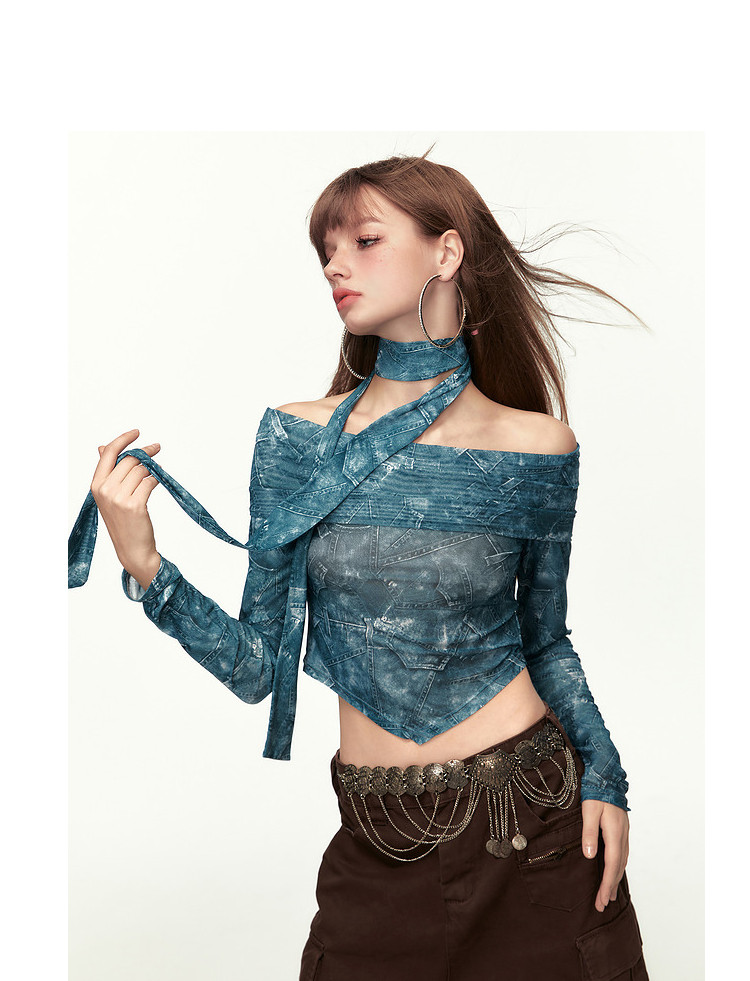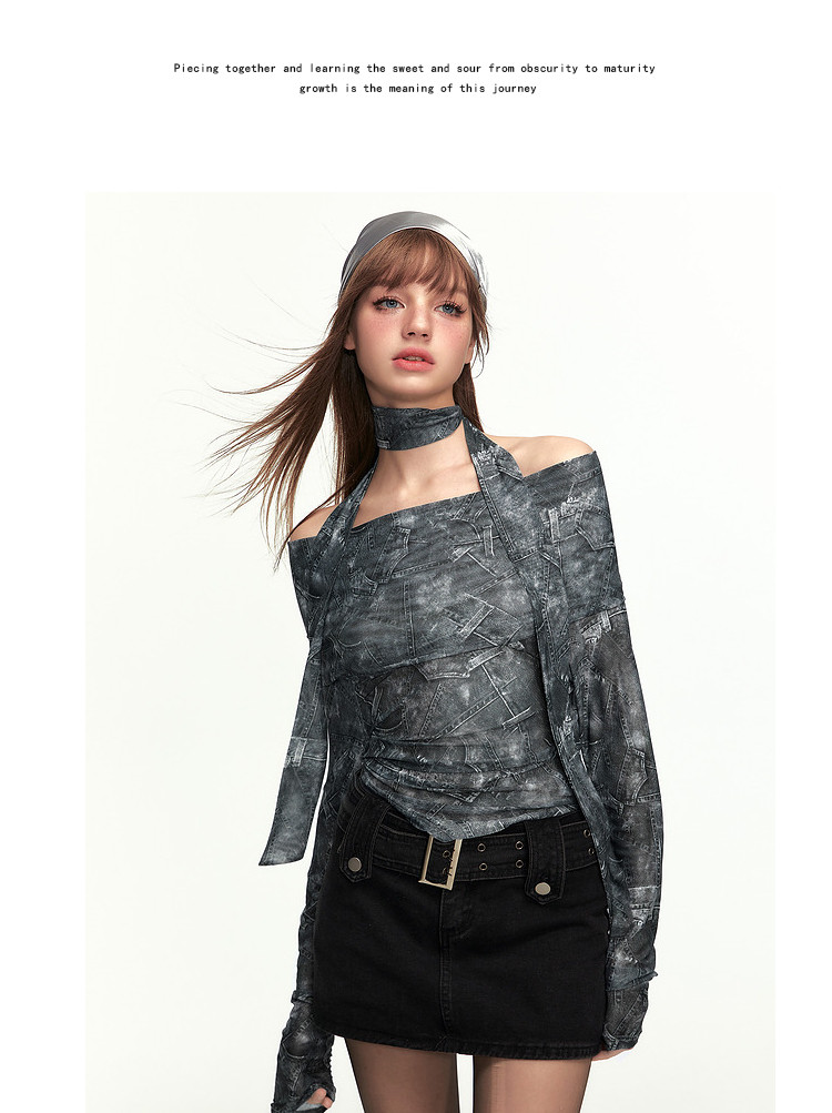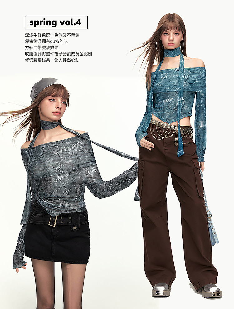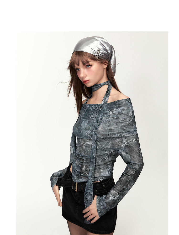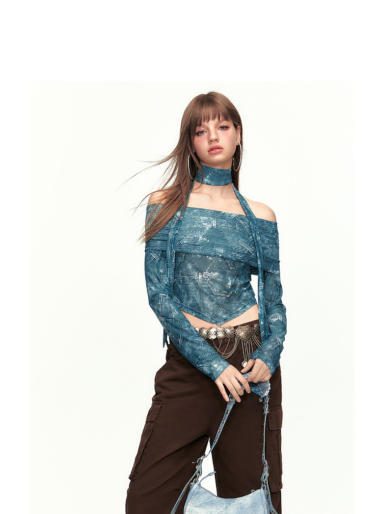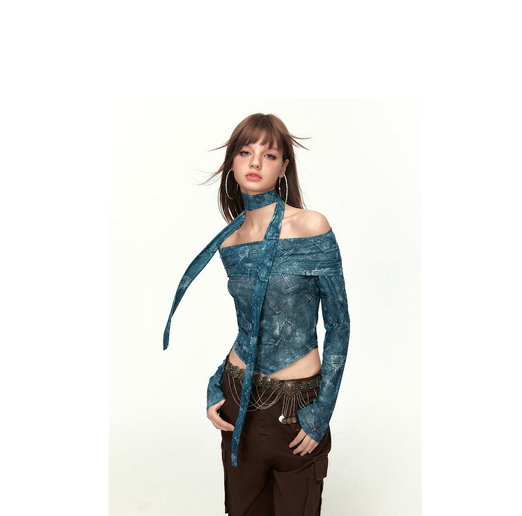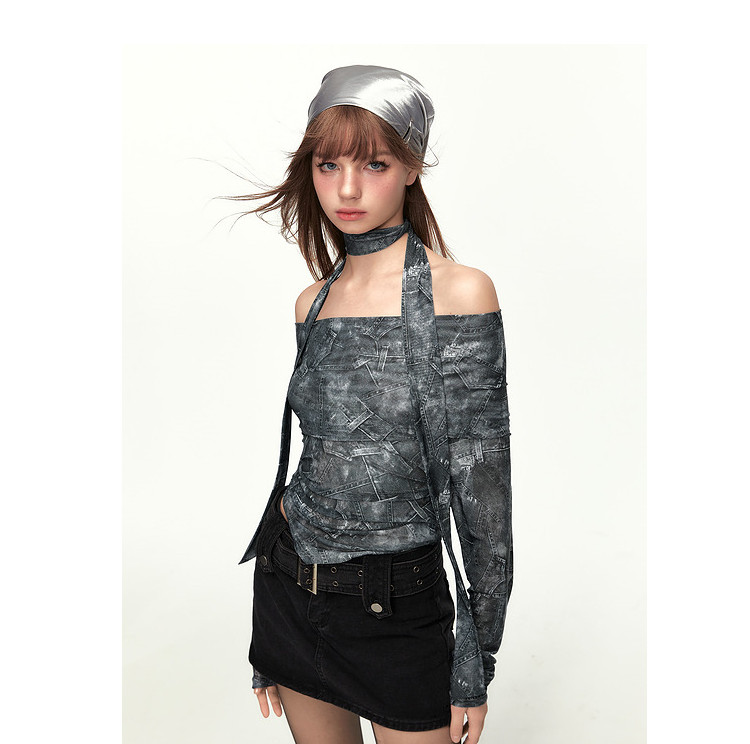 【2024春季】甜酷风印花不规则长袖T恤女一字肩修身打底上衣 284180