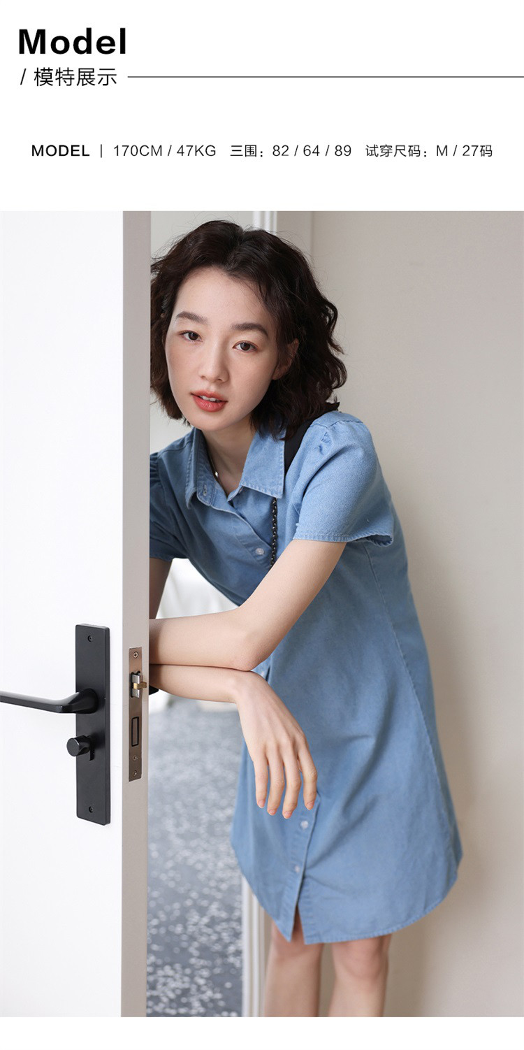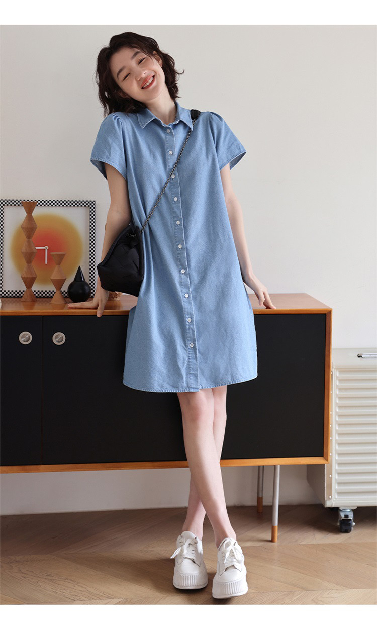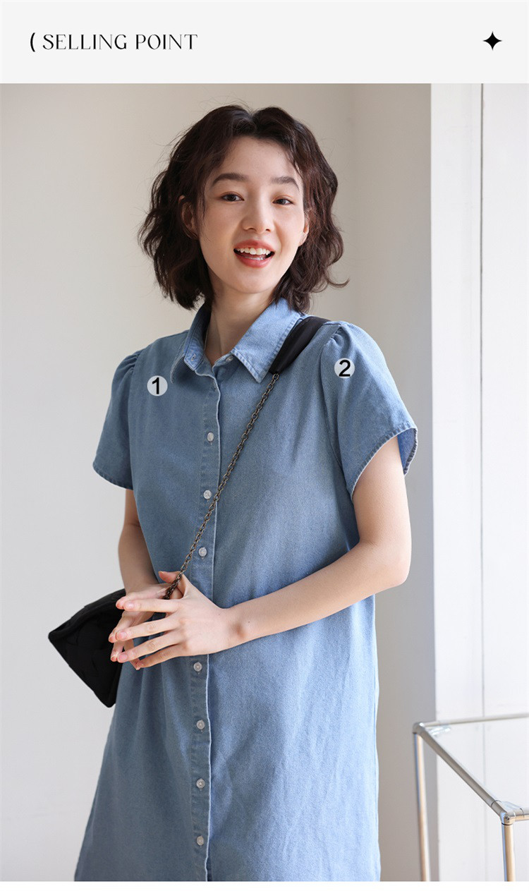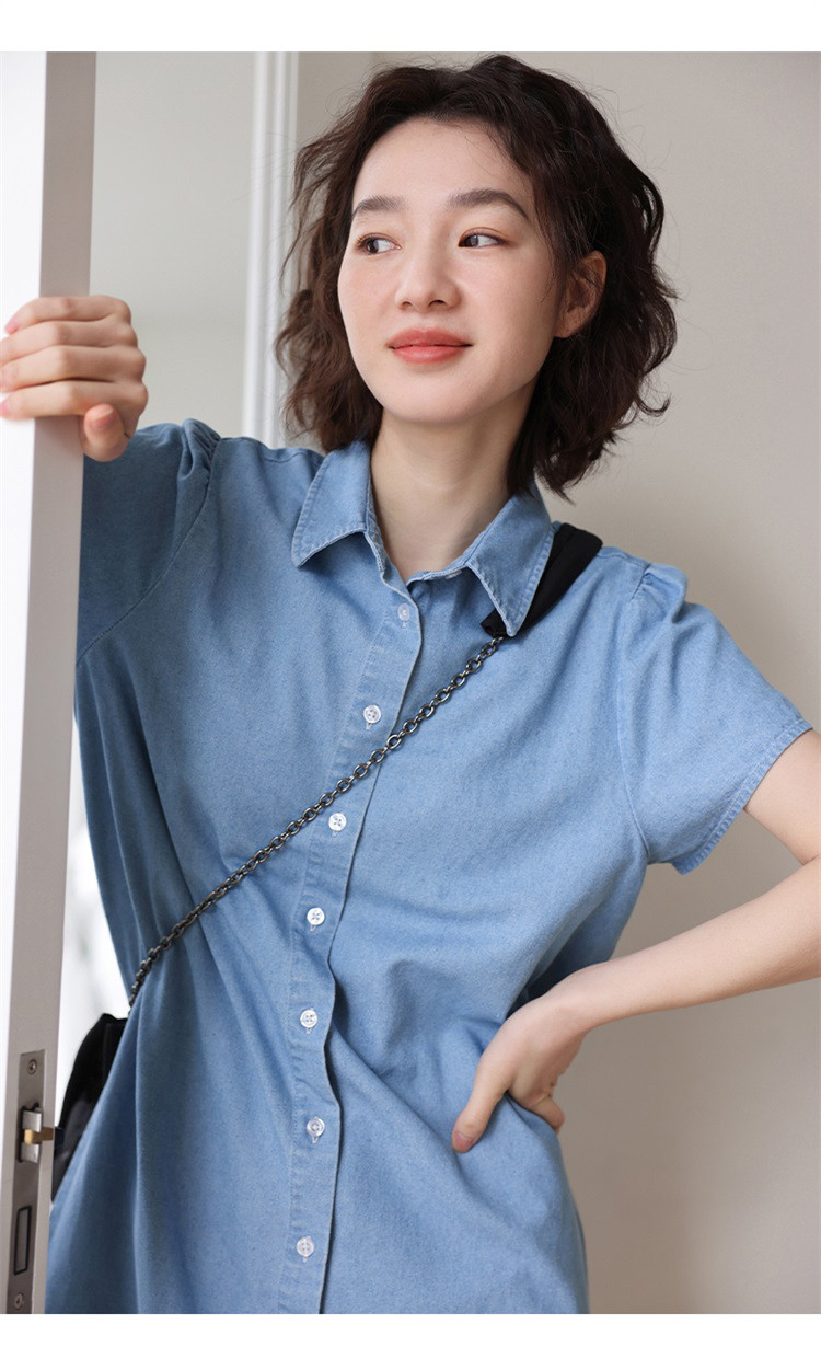 商品名称:【泡泡袖牛仔裙】夏款休闲气质单排扣衬衫式牛仔连衣裙 542722