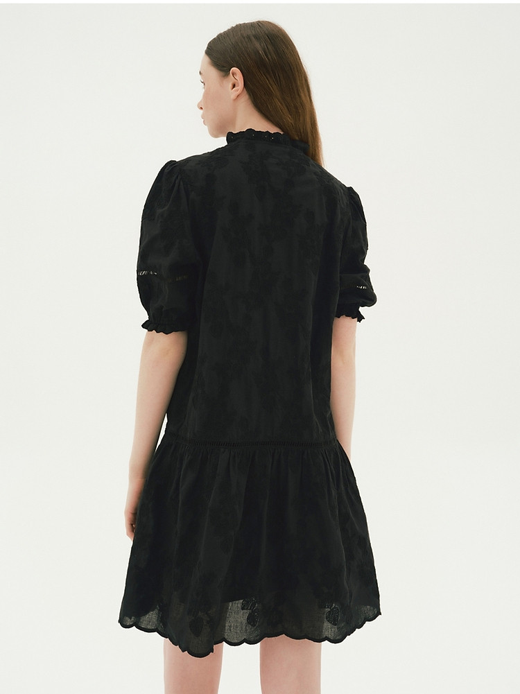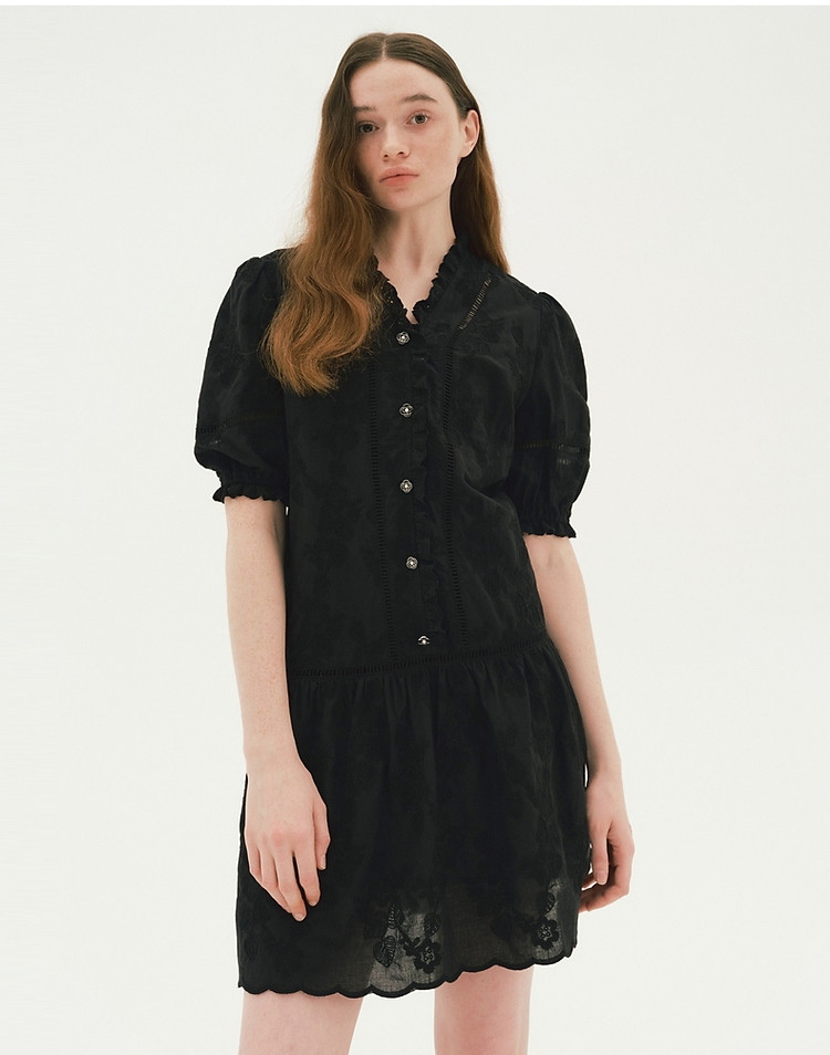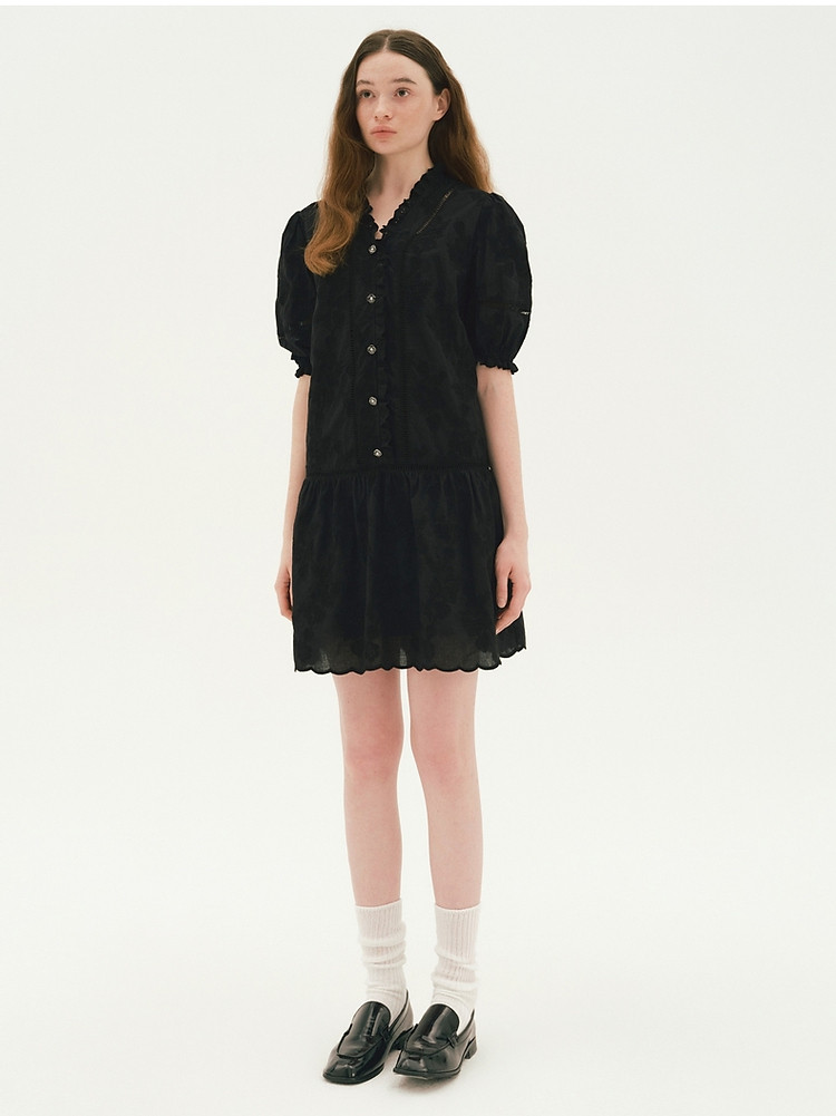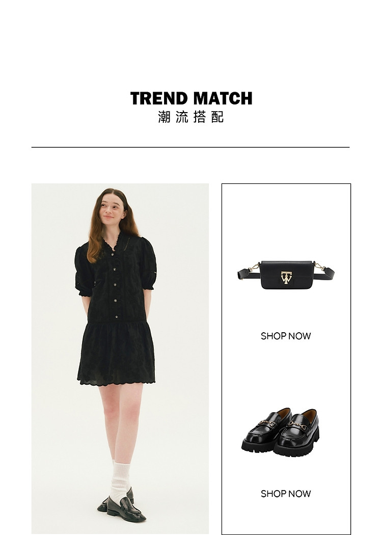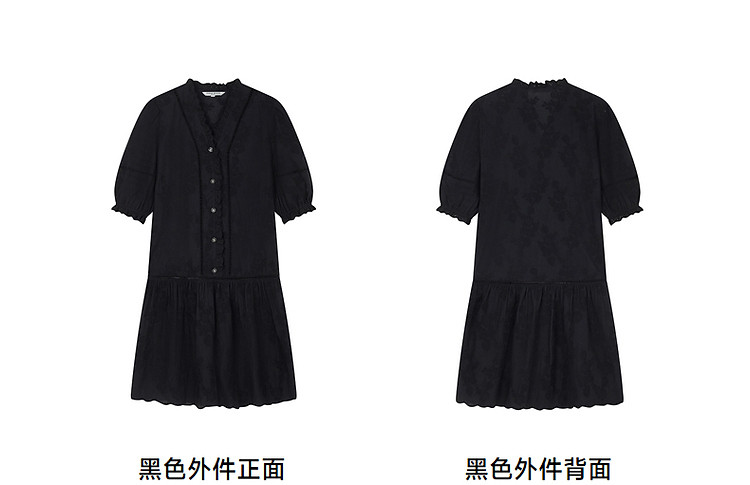 商品名称:小熊设计感镂空花边宽松灯笼袖连衣裙黑色女 587649