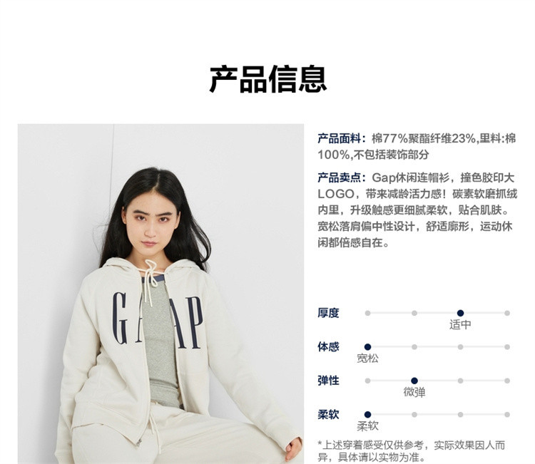 商品名称:Gap女装秋冬LOGO碳素软磨抓绒保暖卫衣809239洋气保暖连帽衫 246426