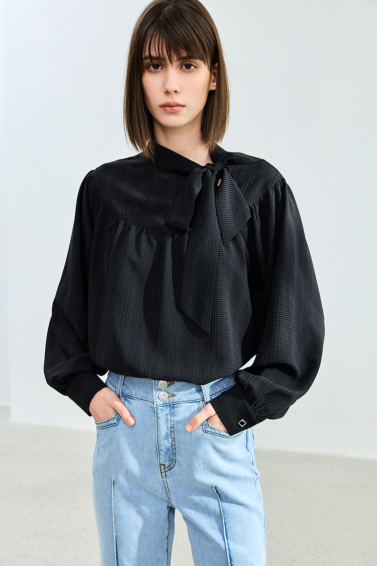 春季法式优雅衬衫女气质系带都市通勤洋气宽松垂坠感长袖衬衫女 767067