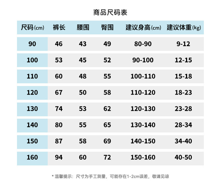 | 尺码 | 身高(cm) | 腰围(cm) | 裤长(cm) | 臀围(cm) | 适合年龄 | 号型 |