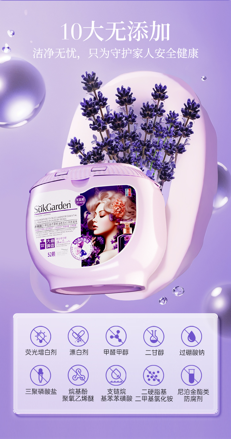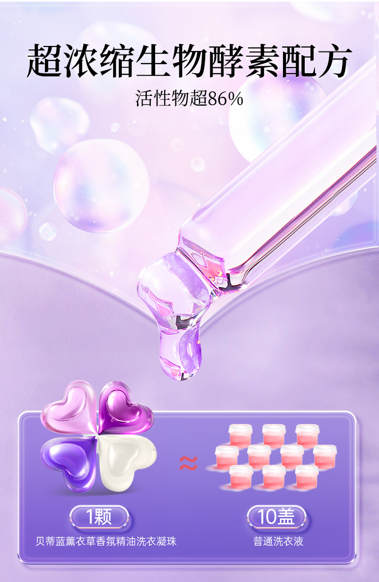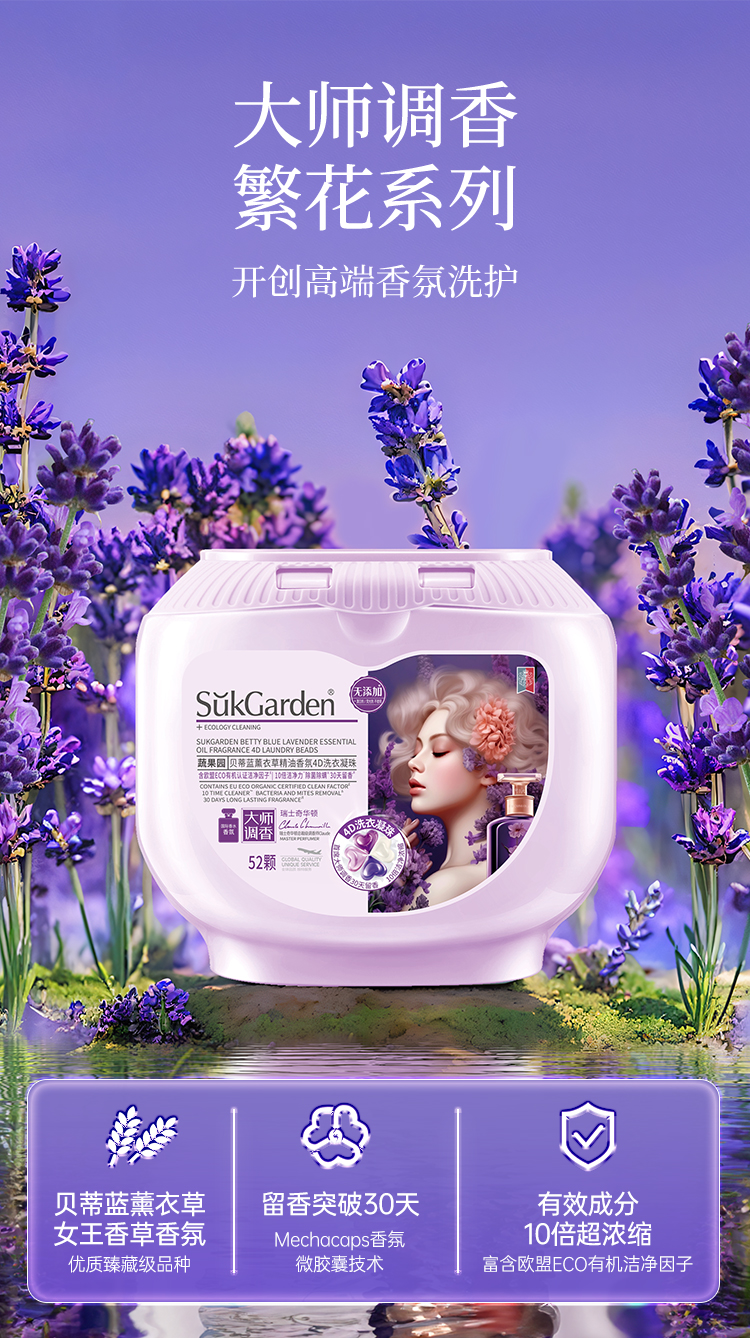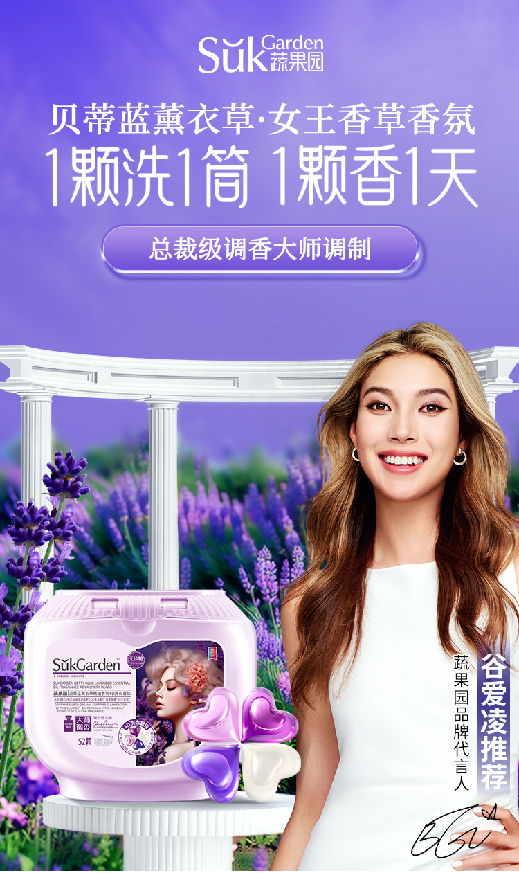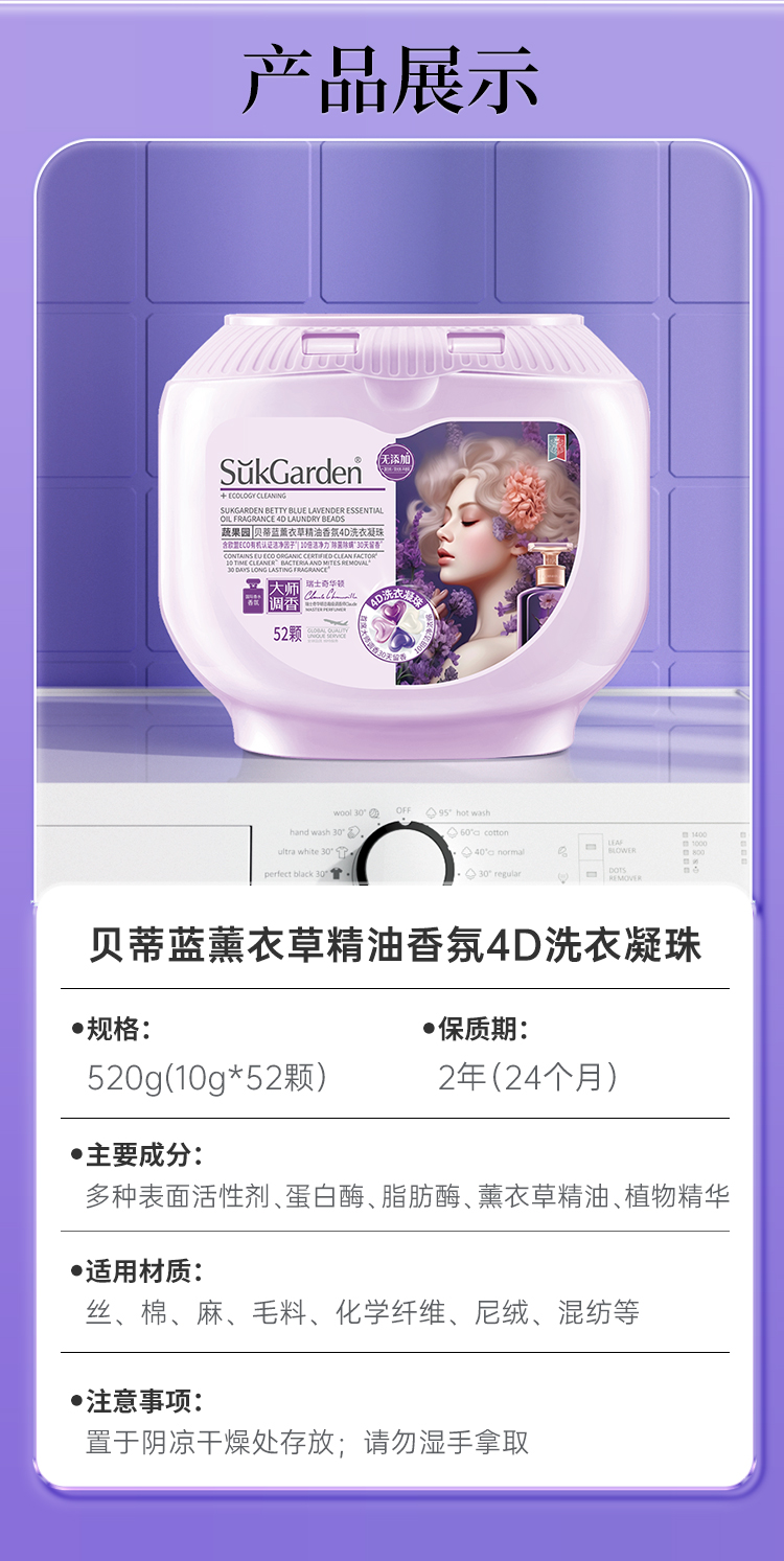 商品名称:蔬果园贝蒂蓝薰衣草香氛4D洗衣凝珠(浓缩型)-10g*52颗*1盒+蔬果园蓝盾香水洗衣凝珠-8g*10颗(袋装)
