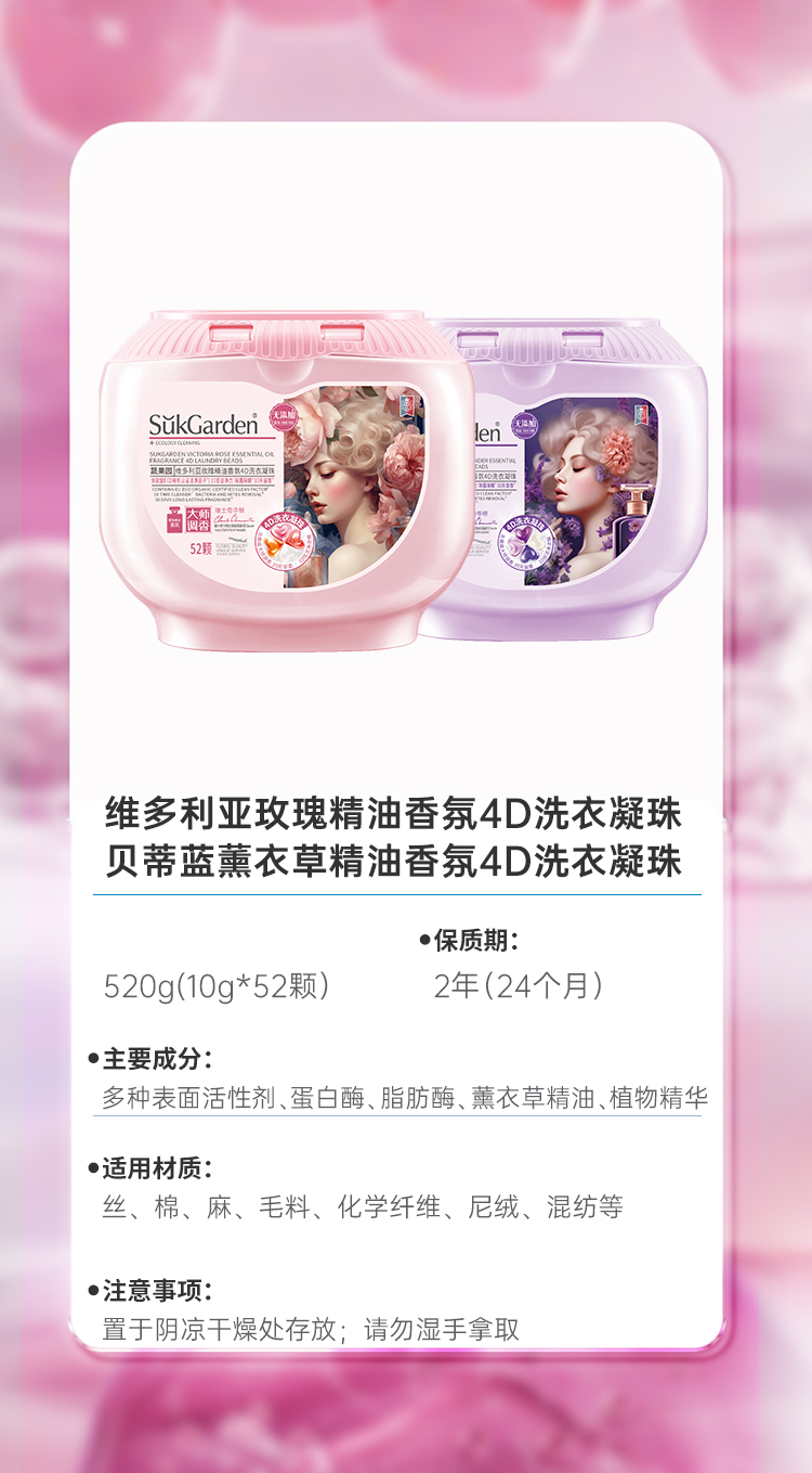 商品名称:蔬果园维多利亚精油香氛4D洗衣凝珠(浓缩型)-10g*52颗*1盒+蔬果园贝蒂蓝薰衣草香氛4D洗衣凝珠(浓缩型)
