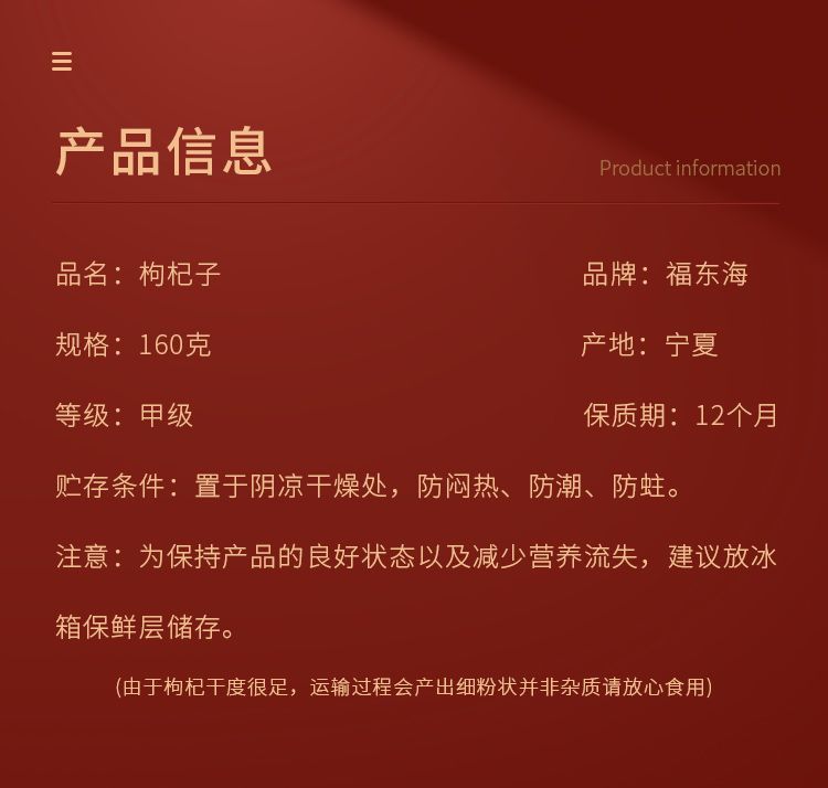 商品名称:福东海 红枸杞160克/瓶 FDH01010515