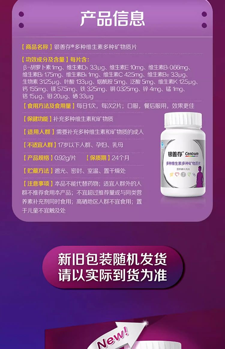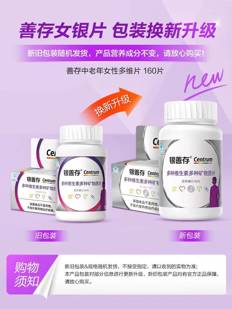 商品名称:善存银善存中老年女士复合维生素矿物质片50岁以上维生素C维生素e保健品 含烟酰胺钙铁锌160片新旧包装随机发
