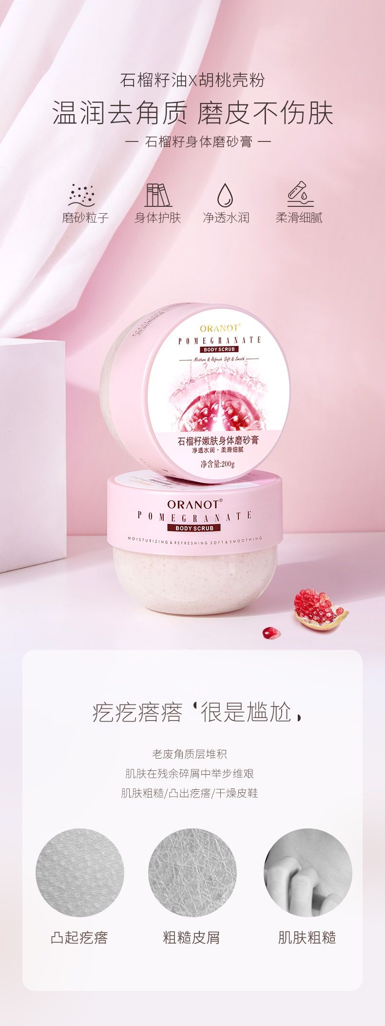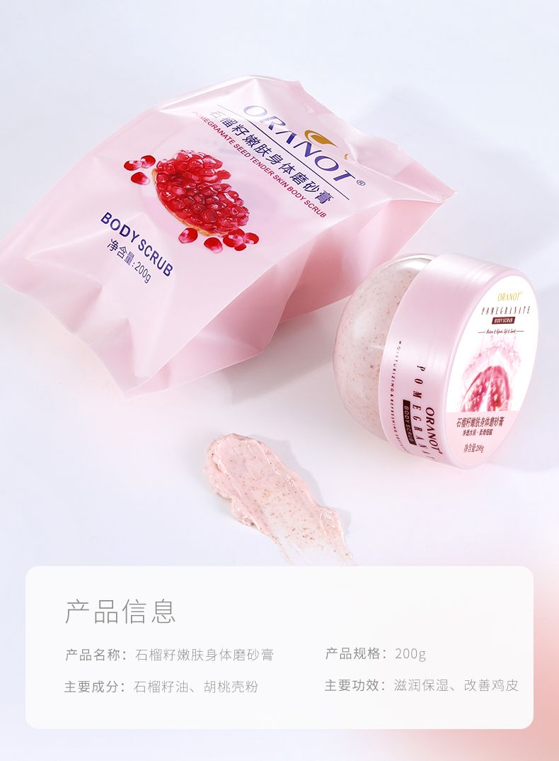 商品名称:奥兰诺 石榴磨砂膏 200g 身体嫩白全身手部鸡皮去角质疙瘩毛囊腋下黑脖子