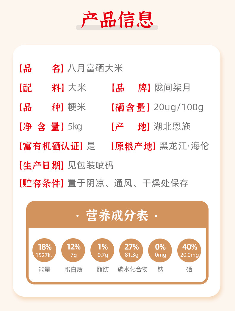 商品名称:陇间柒月富有机硒认证八月富硒香软糯大米圆润饱满5kg