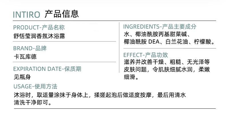 商品名称:卡瓦库德 舒恬莹润香氛沐浴露 780ml 洁净保湿嫩肌