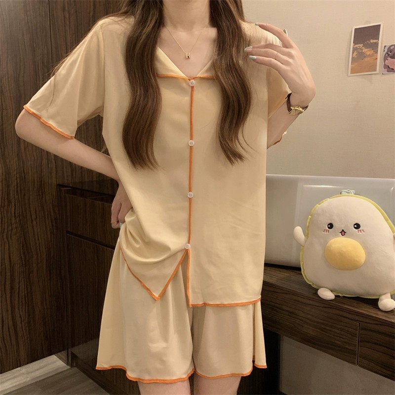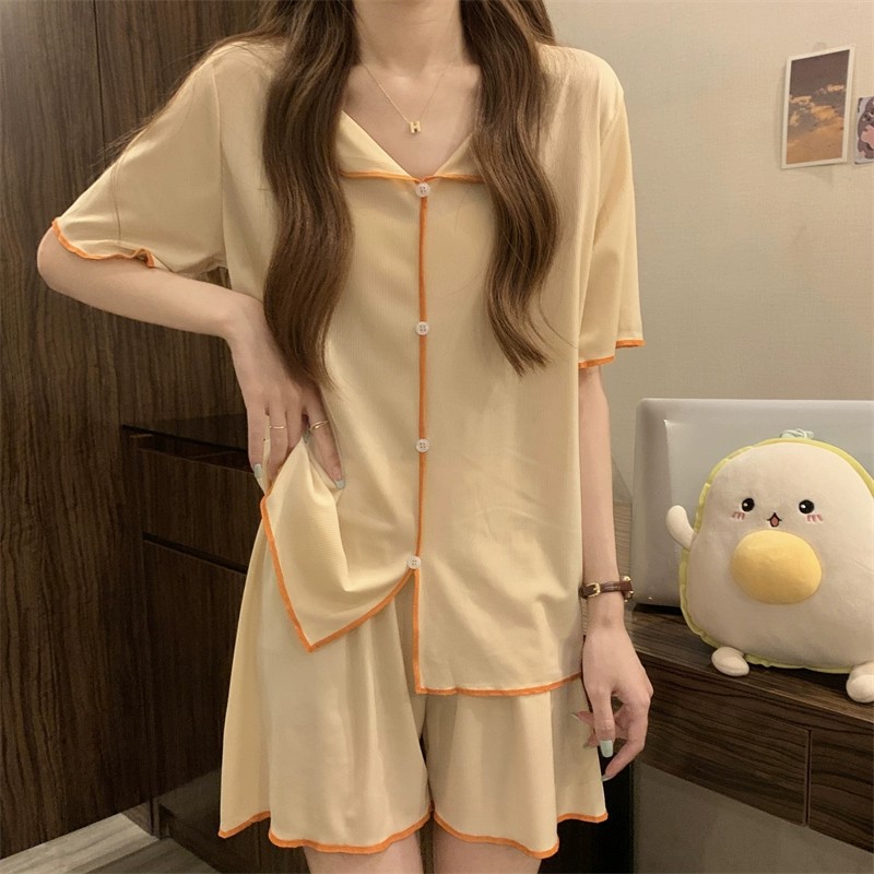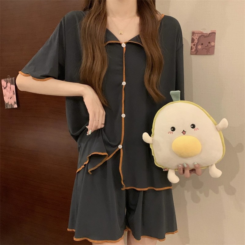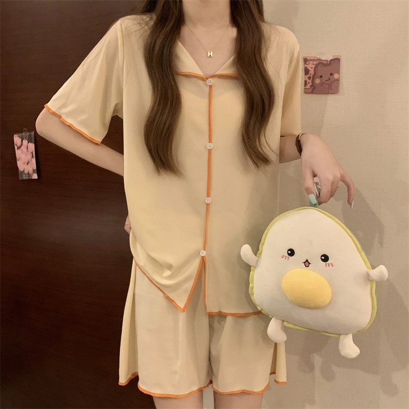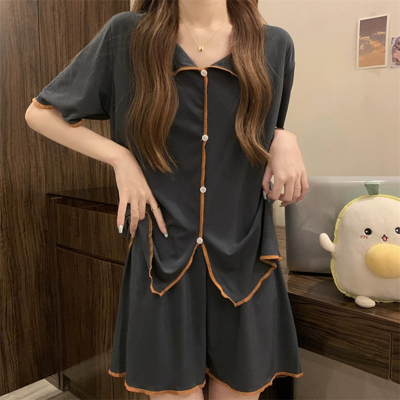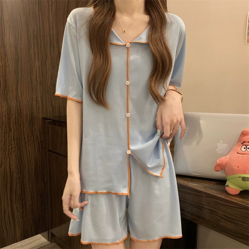 商品名称:短袖睡衣女QQ套装韩版薄款假开衫翻领纽扣简约冰丝凉凉仙女家居服