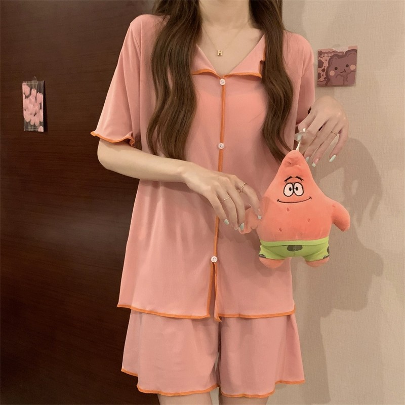 短袖睡衣女QQ套装韩版薄款假开衫翻领纽扣简约冰丝凉凉仙女家居服