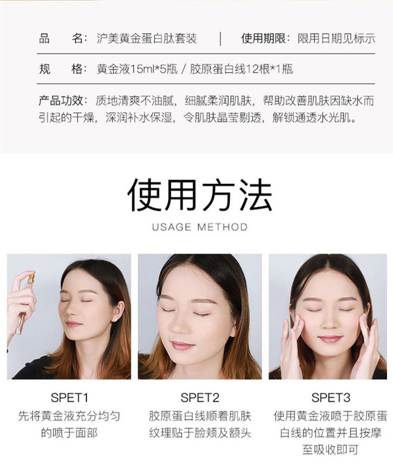 商品名称:沪美 黄金蛋白肽线雕套盒 黄金液15m*5瓶/胶原蛋白线12根*1瓶 补水保湿