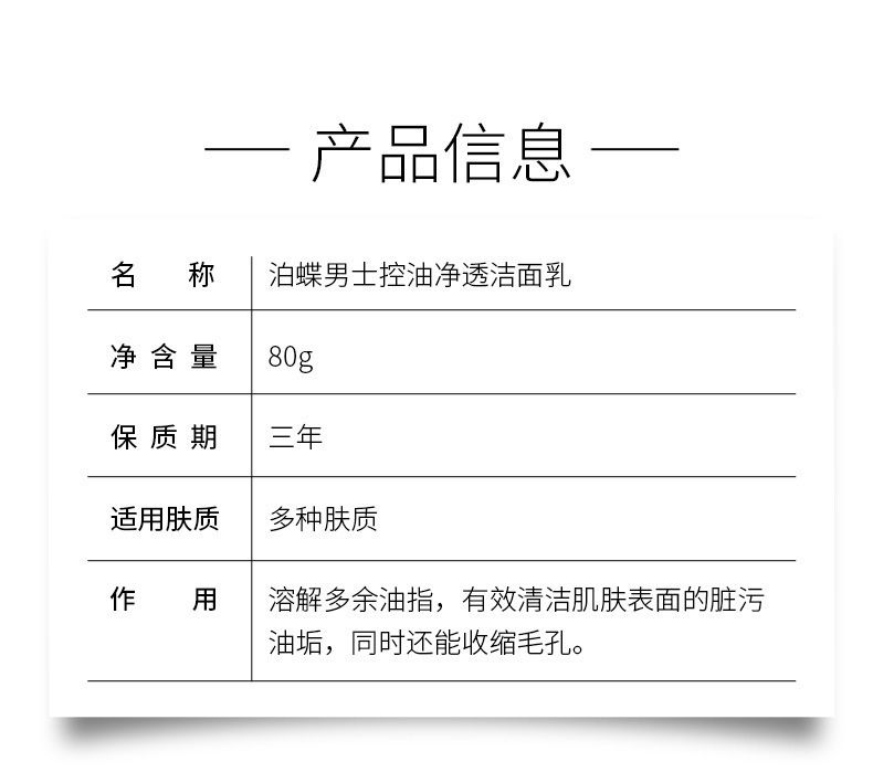 商品名称:泊蝶 男士净透洗面奶 80g 深层清洁补水保湿