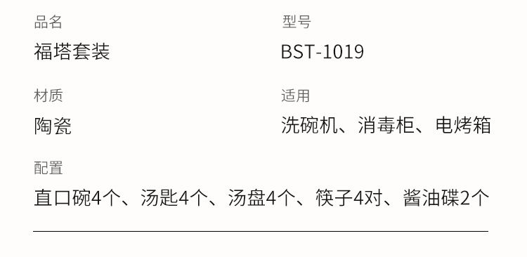 商品名称:栢士德 福塔套装4.5寸直口碗4个+汤匙+8寸汤盘+筷子+3.8寸油碟BST-1019