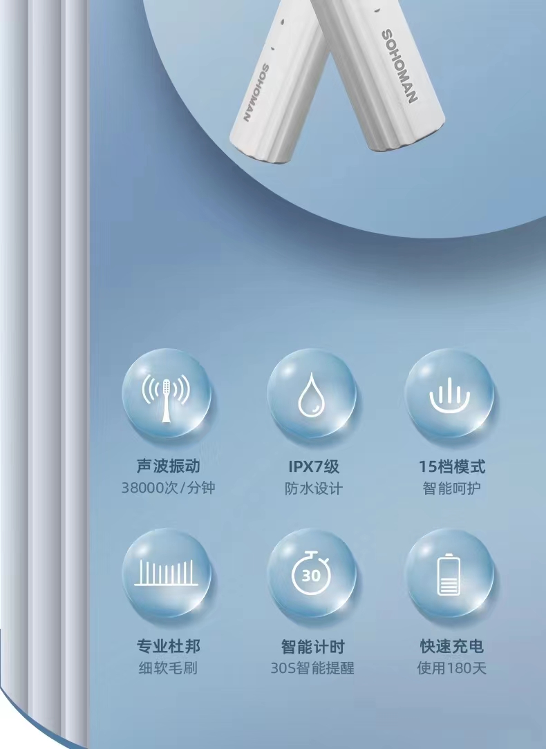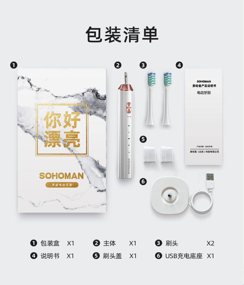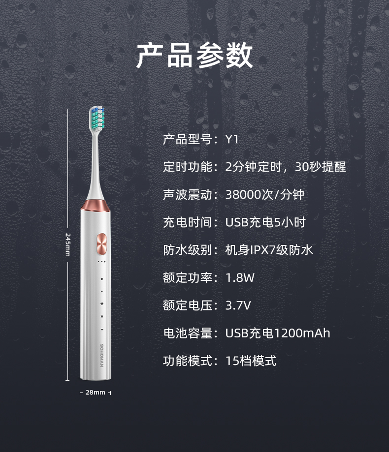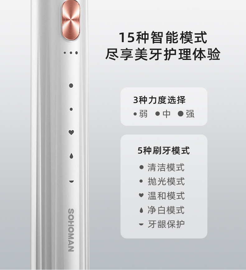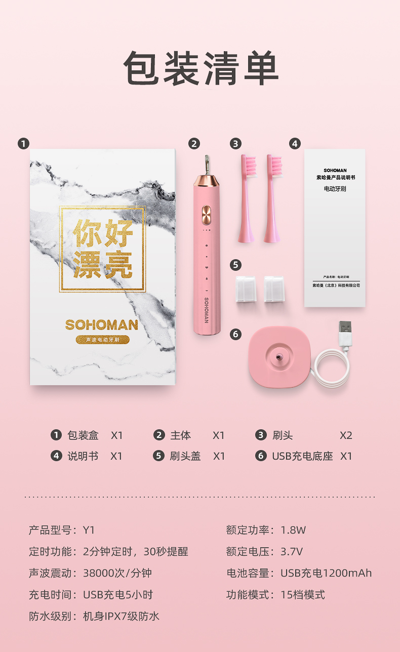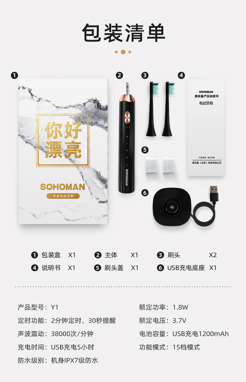商品名称:索哈曼(SOHOMAN) Y1电动牙刷男女成人软毛超声波全自动情侣款智能充电式礼盒 续航180天