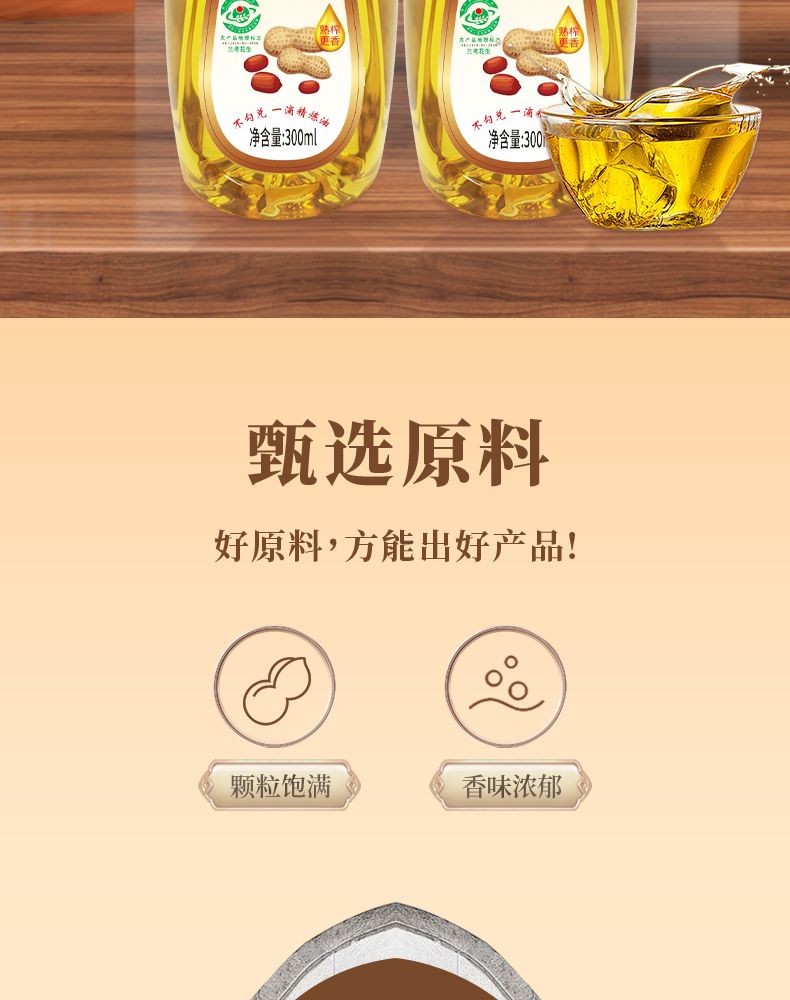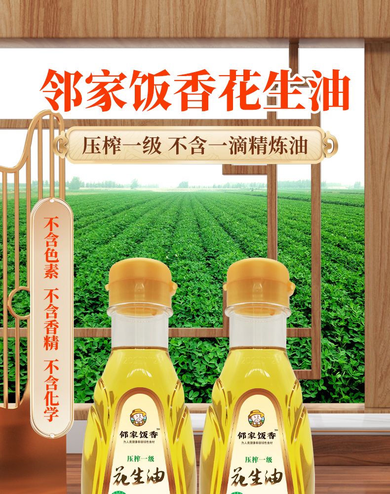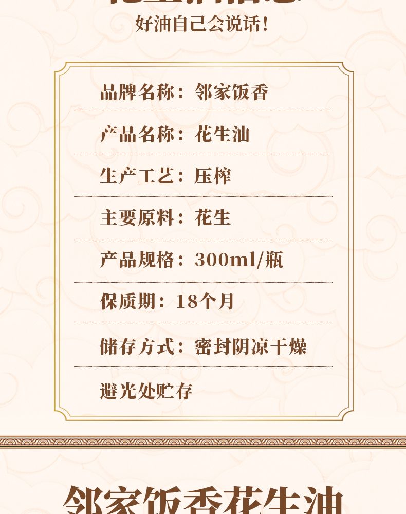 商品名称:邻家饭香压榨一级花生油LJFX27不勾兑精炼油国家地理标志农产品兰考花生原产地直发300ml/瓶