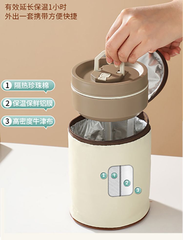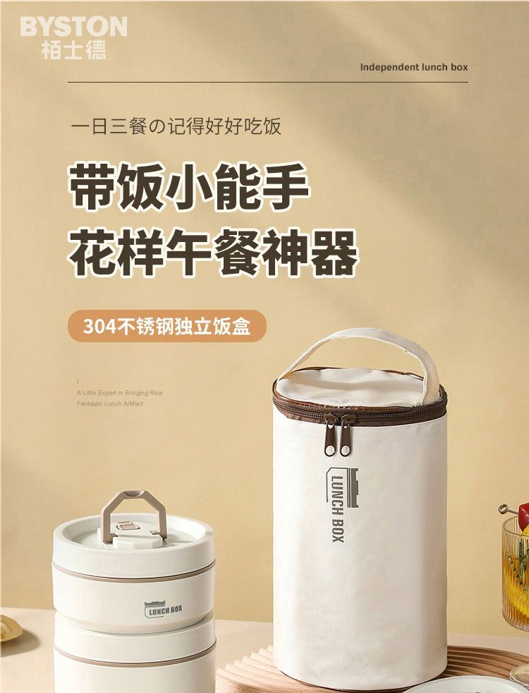 栢士德(BYSTON)304食品级不锈钢BST-142三层保温便携便当盒 饭盒+保温袋1400ML 米色三层独立饭盒14